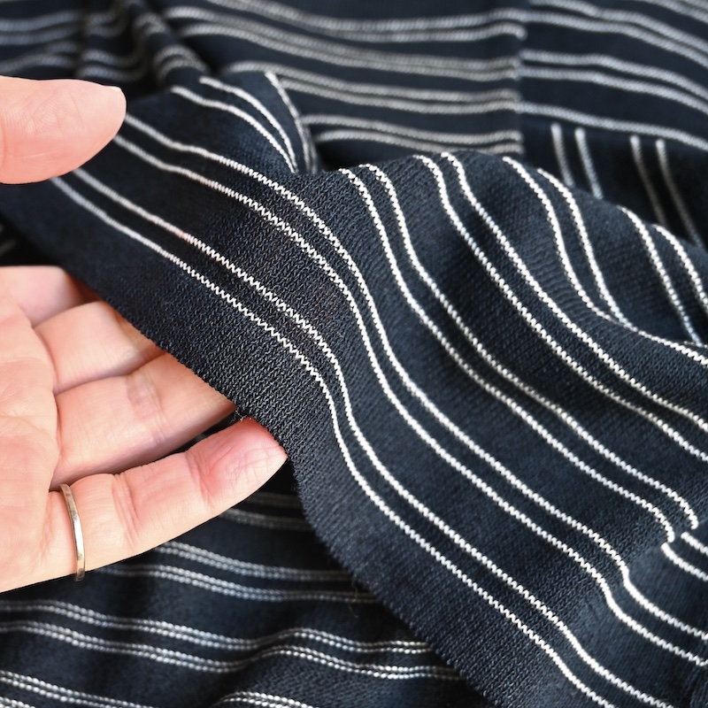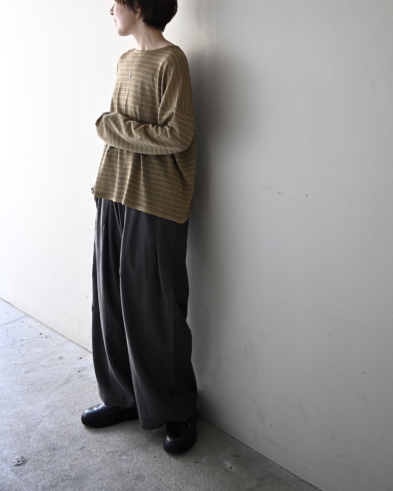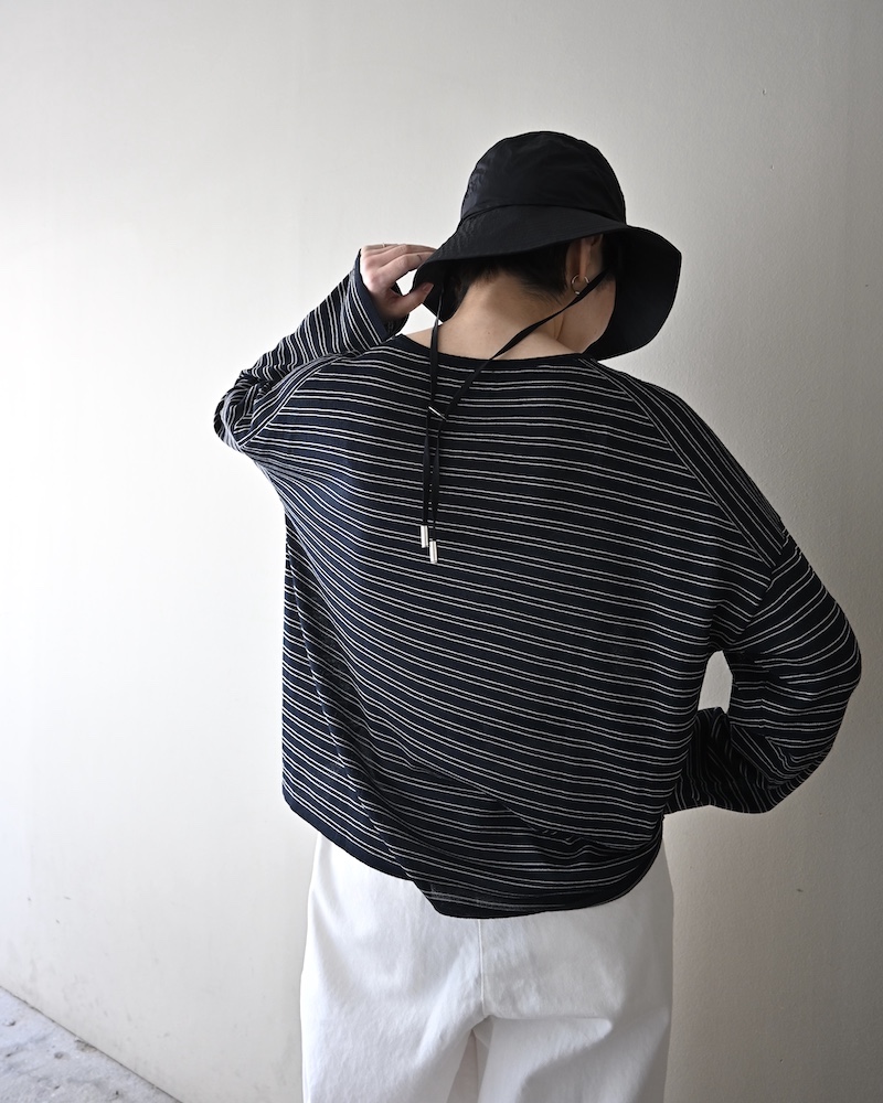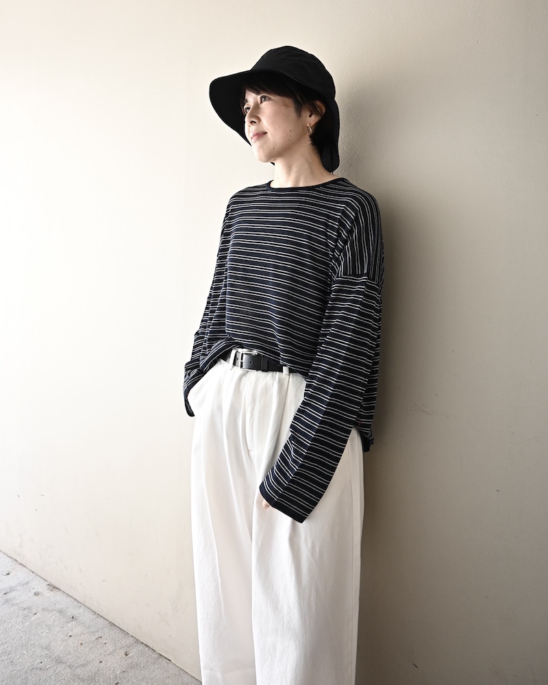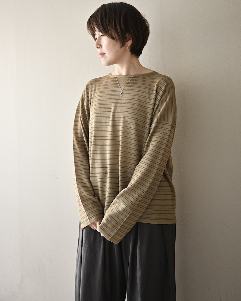 3つ目は一枚で気負いなく、サッと身につけられるサイジングが心地よいボーターの長袖ニット。実は昨年の秋冬コレクションでリリースされたアイテムで、ウールがブレンドされた素材なのですが、ウールとは信じがたいようなシャリサラ感にびっくりしました。
