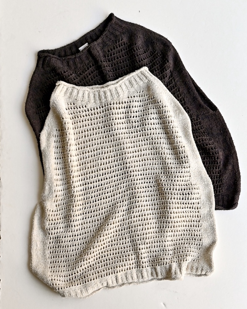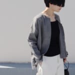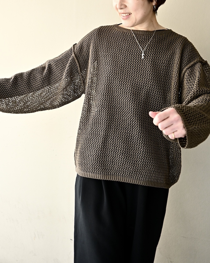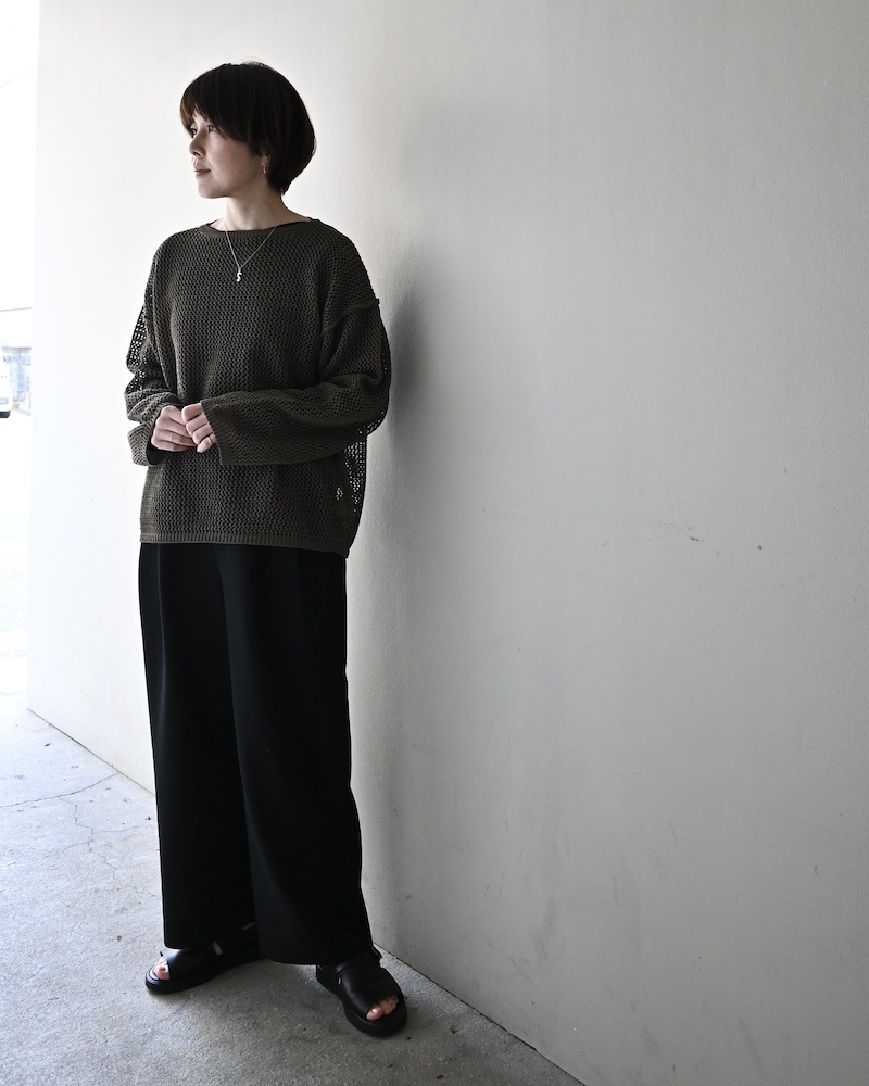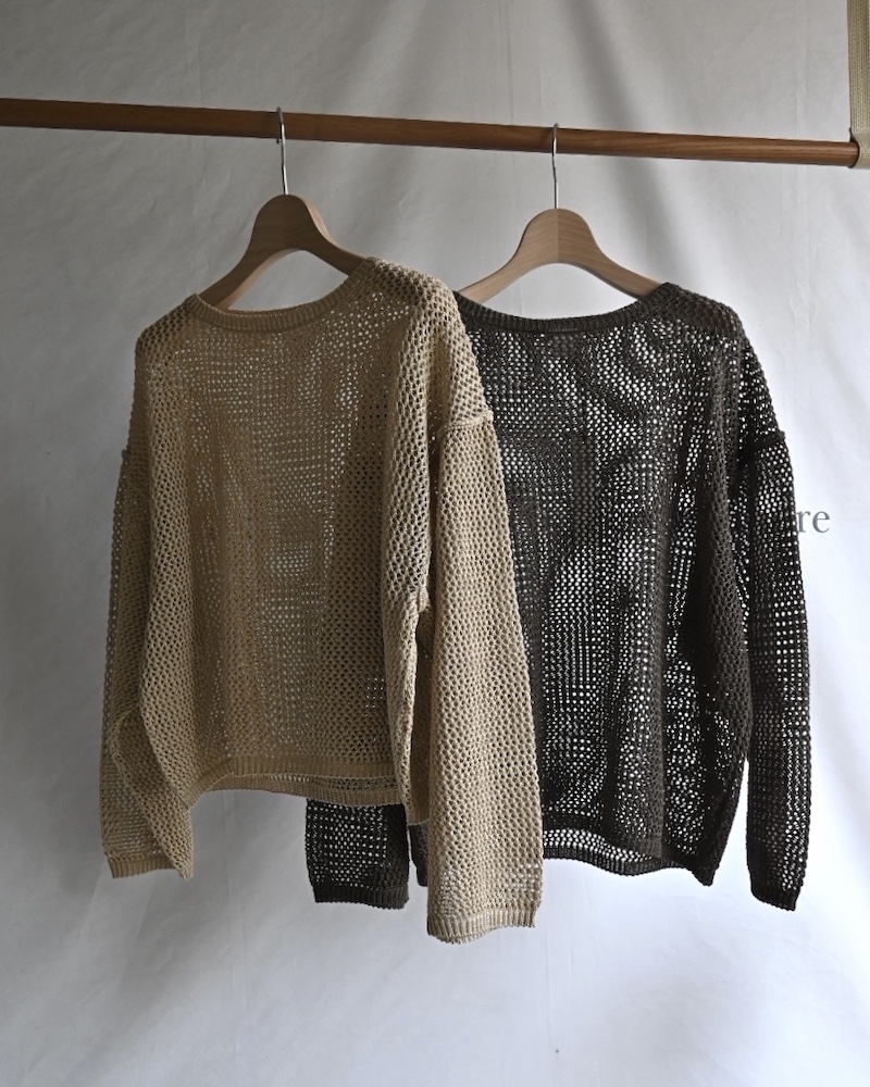 最後は重ね着のおしゃれを満喫できそうでわくわくするメッシュニットトップス。ほんのり光沢のあるコットン素材はドライなタッチで風通しは当然抜群、夏も気兼ねなく身につけられます。今っぽいオーバーサイズのシルエットだけではなく、肩のアウトシームやぽてっとする袖口まわりのシルエットなどディティールも凝っていてグッときますね。