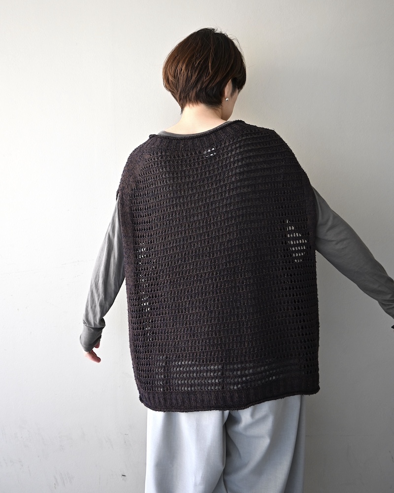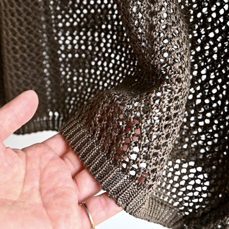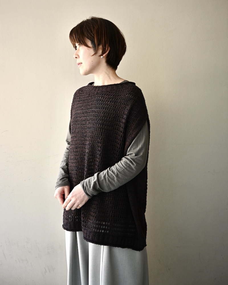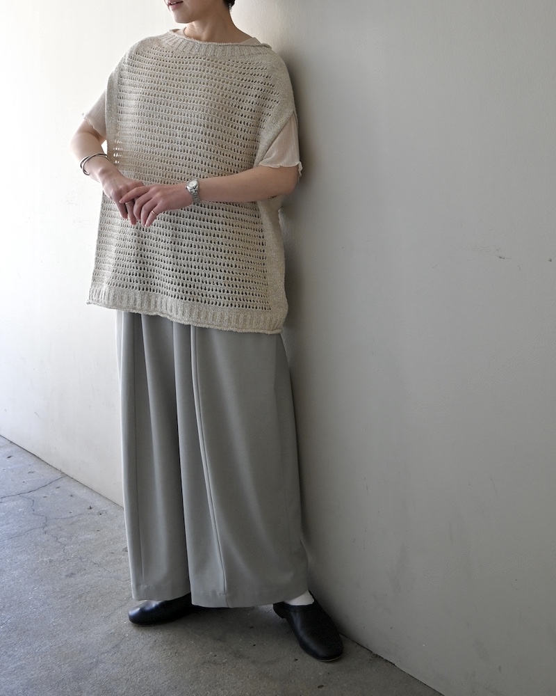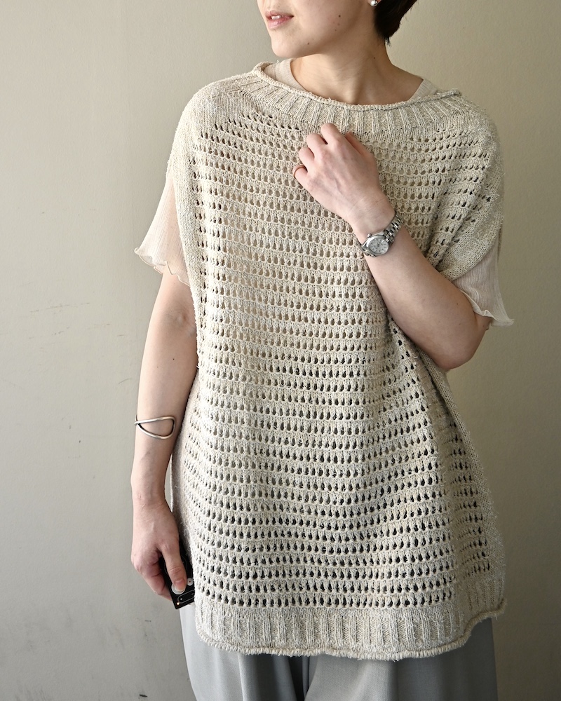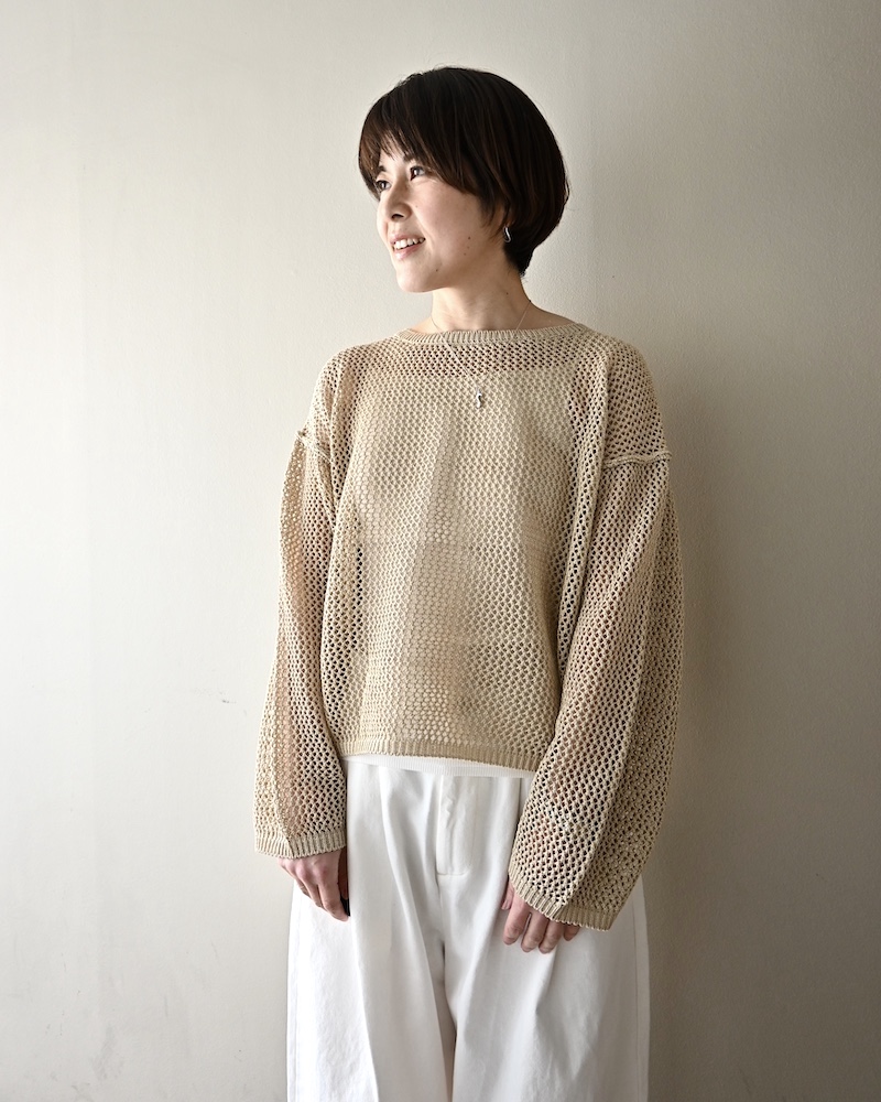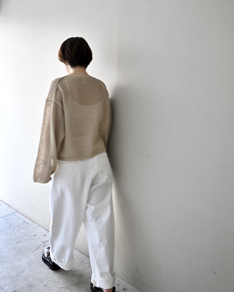 ヒップを覆うたっぷりとした着丈をボリュームあるパンツとあわせたゆるっとスタイルもなんとなくすっきりと見せてくれます。重量があるように思えるかもしれませんが軽さがあり、サラッとした中にシルクならではのしっとりとした柔らかさも感じられる着心地です。貝殻から着想を得たオリジナルの編み地は透けすぎずの良いあんばい、肩と二の腕をさりげなく覆ってくれるので、真夏にもタンクトップなどに重ねて涼しい顔で楽しんでいただきたいです。
