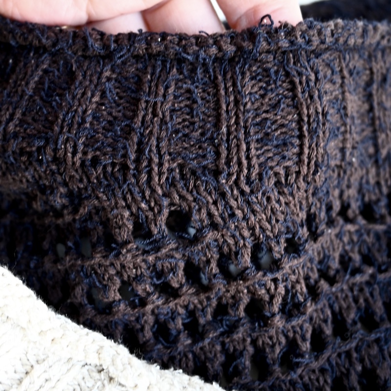 ノイシルク(シルクの一般的な長い繊維とは異なり、製造過程で出る短い繊維を紡いだものです)100%の糸と、凹凸感のある糸を組み合わせたざっくりラフな表情が特徴的です。