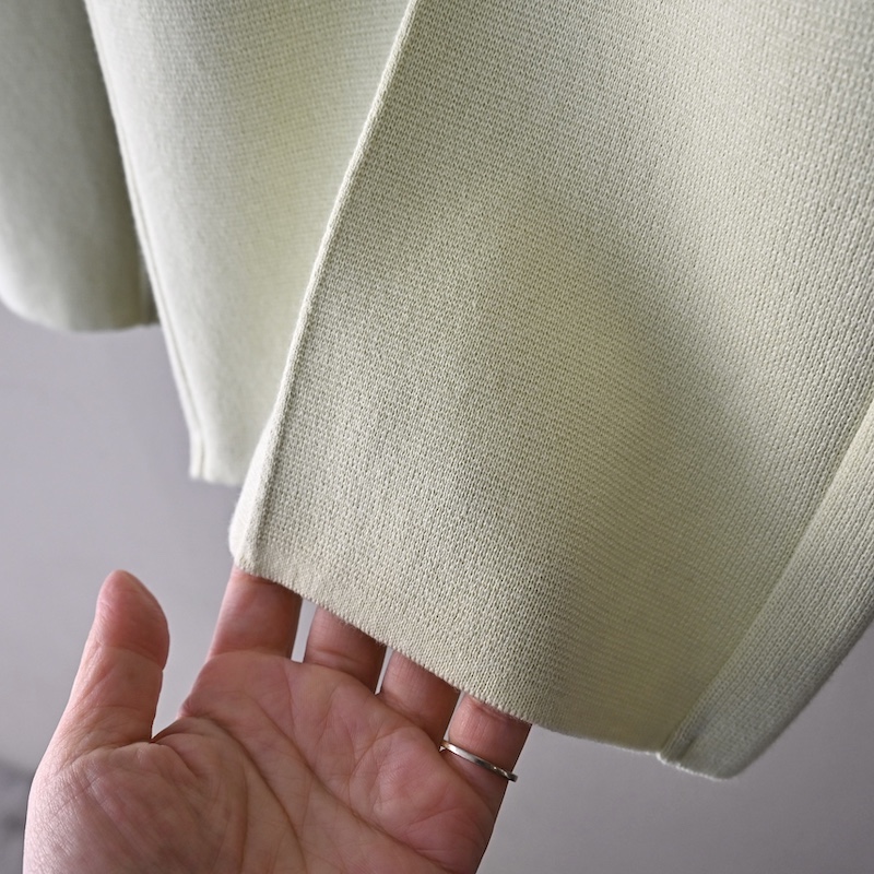 ニットブランドさんなので、パンツももちろんニットで!春らしい優しげなカラーリングに惹かれました。肌ざわりも同じく優しいコットン100%です。ぎゅっと詰まったミラノリブの編み地を採用することで気になるボディラインを拾いにくく、膝伸びなどのシルエット崩れが起きにくいよう配慮されています。ある程度の重さもキレイなシルエットに貢献してくれているようです(だからといって着づらい重さではないのでご安心を!)。