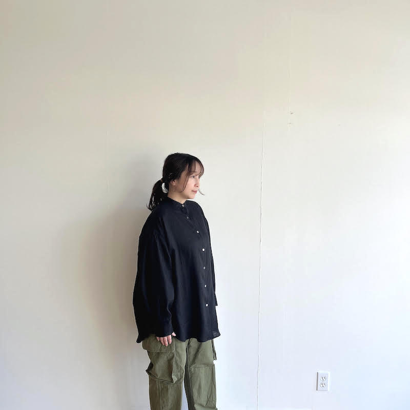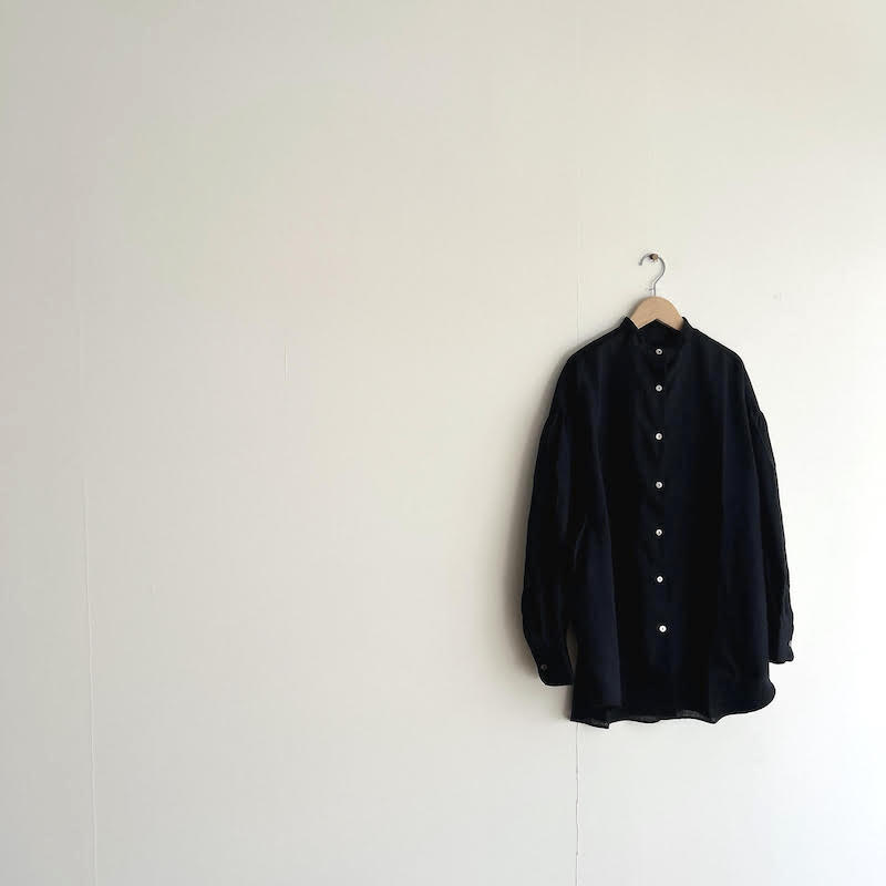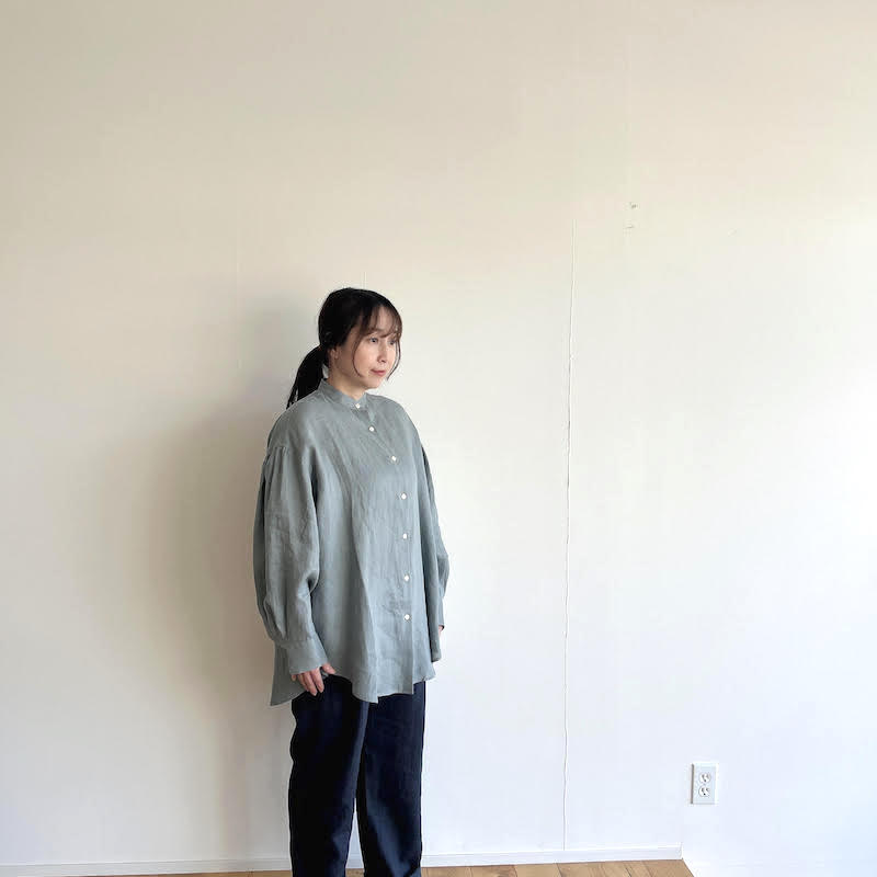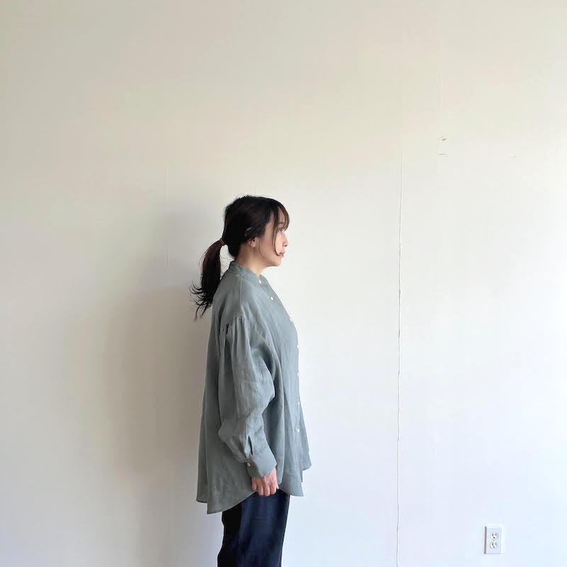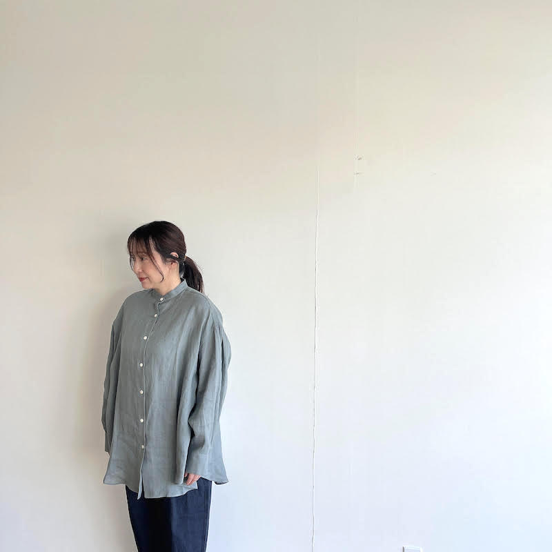 柔らかさを失わないよう、リネン特有の透け感を最小限に抑えるように尾州の旧織機でゆっくりと織り上げたシンプルなスタンドカラーのオーバーサイズシャツです。