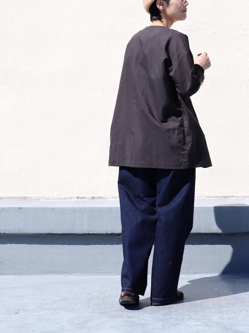 フロントの小さなボタン。わずかにラウンドした裾のライン。両サイドのポケット。過不足のないプレーンなデザインが、他とは違う空気感を演出しています。