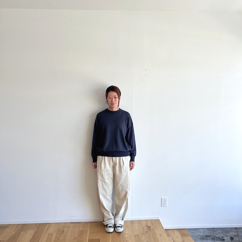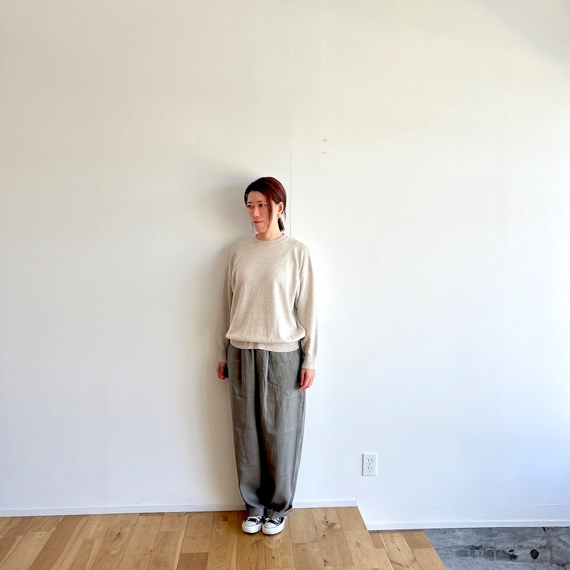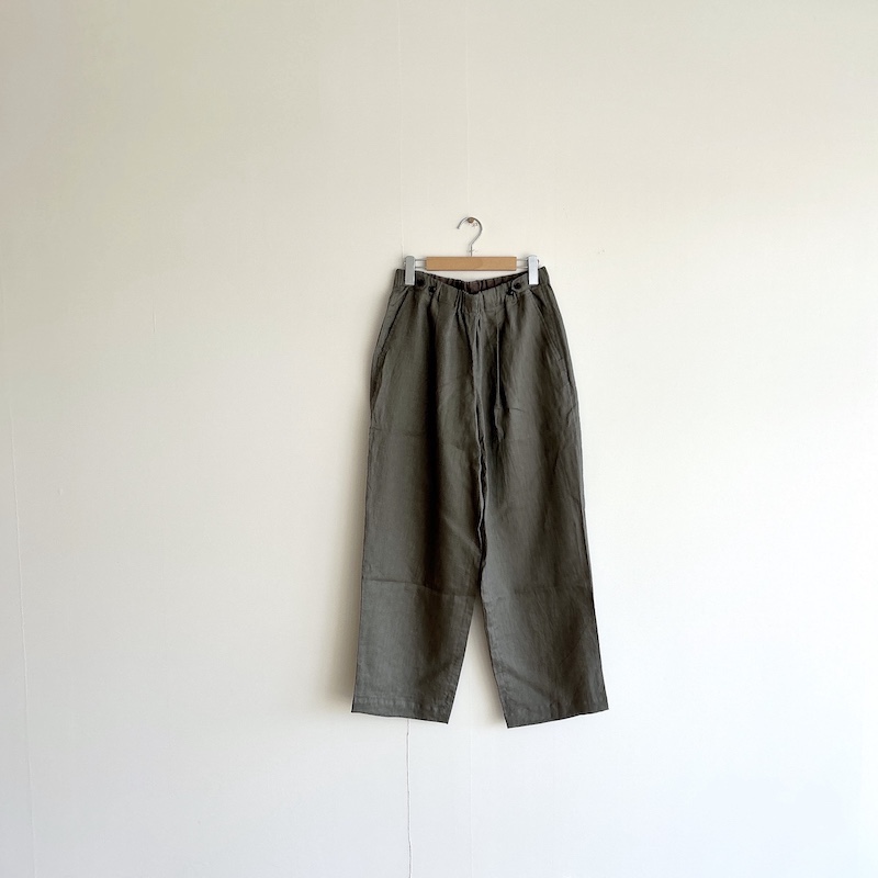 合わせているパンツもcomm.arch.を。フレンチリネンを使用したイージーパンツ。ワイドパンツとはいっても裾に向かってテーパードが効いているので綺麗なシルエットですね。