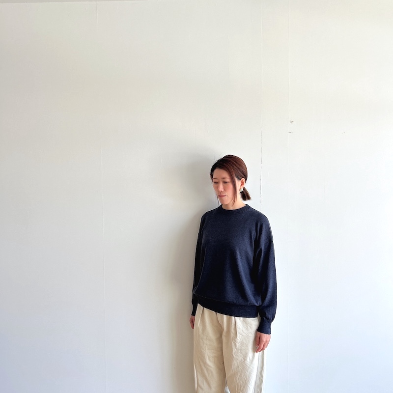 型はいたってシンプルでスタイリングしやすく、個人的にはこの生地の厚みで裾リブの溜まり具合がまた良いかと思います。
