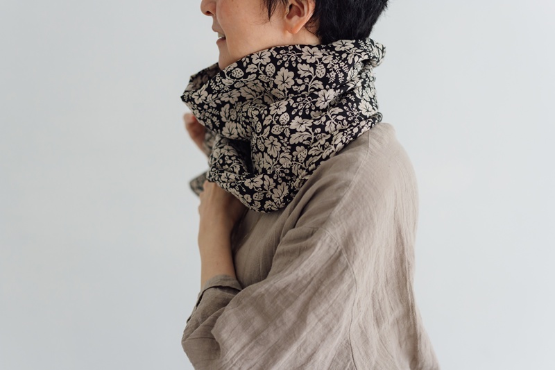 ストールやスカーフとして使うだけでなく、もう少し自由に、境界を決めずに使えたら。そして、ひとつの形に留まらずアレンジしながら楽しめたらいいな、と思ったのが、このストールボレロを考えたはじまりでした。羽織ったり、巻いたり、ゴムで留めたり、ターバンとして使ったり。そのときの気分や装いに合わせて、自然と形を変えて寄り添ってくれる存在になればと。