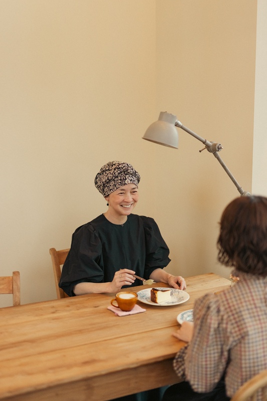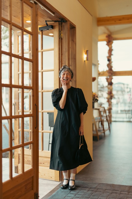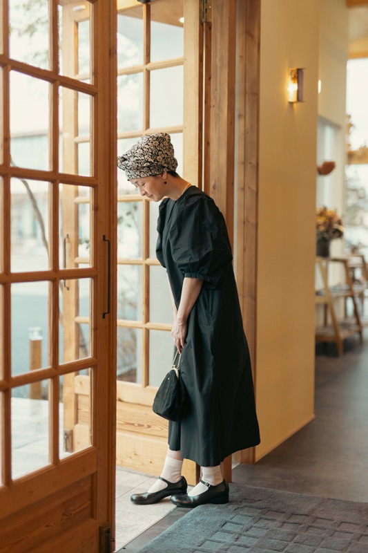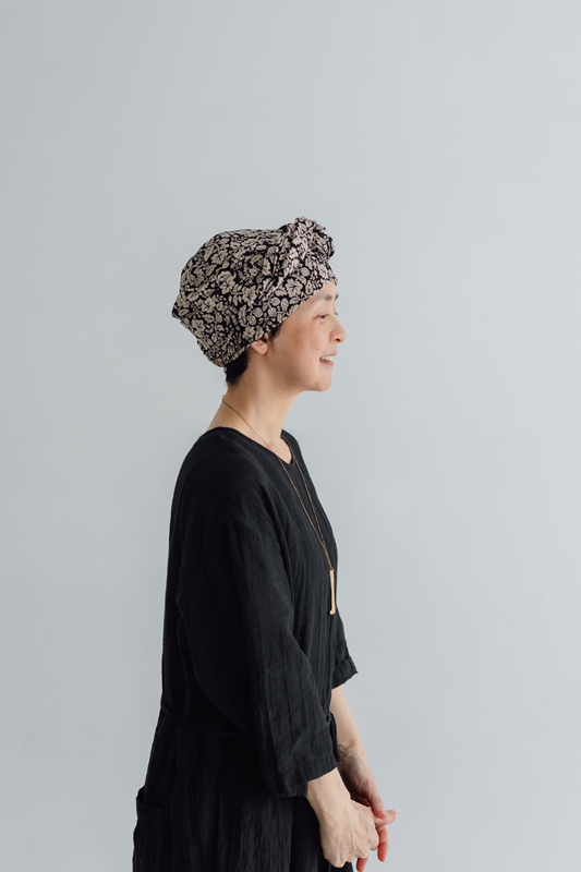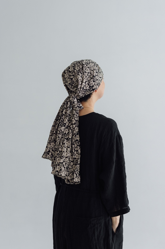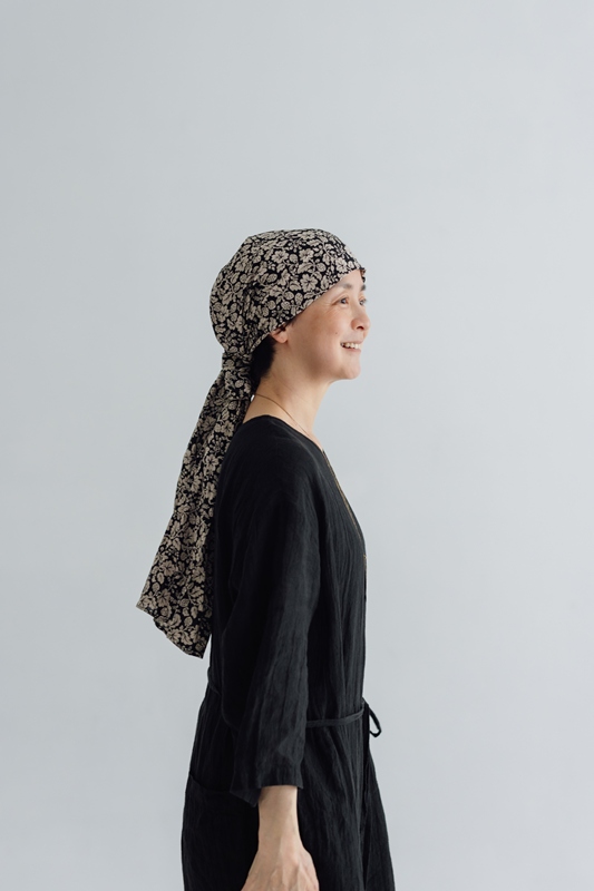実はこの一枚を作ろうと思ったきっかけは、自分自身の経験からでした。昨年、病気の治療で髪が抜けてしまったことから、頭に巻くストールやスカーフが手放せない日々に。最初は戸惑いもありましたが、せっかくならと、その日の装いに合わせて選んでみたり、巻き方を変えてみたり。そうしているうちに、“隠すためのもの”だったはずが、おしゃれの一部として楽しめるようになっていました。