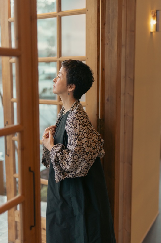 今回、頭に巻くターバンにもなる長さのリネンストールが欲しいなぁ……というところから相談をスタート。ボレロのように肩にかけたり、ストールのように首にくるりと巻いたり、その日の気分や装いに合わせて、形を変えながら寄り添ってくれるものにしたくて、ストールボレロという形になりました。