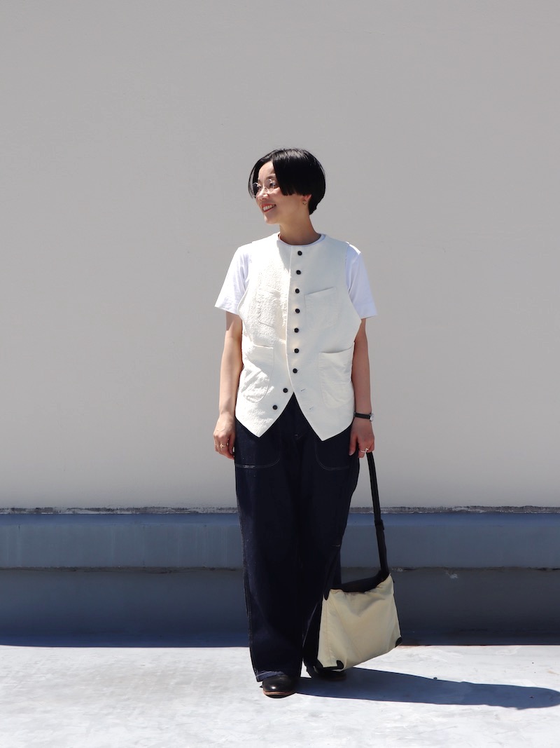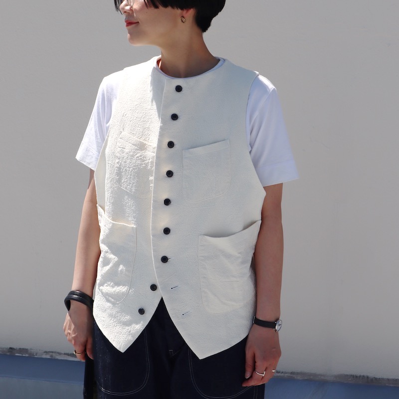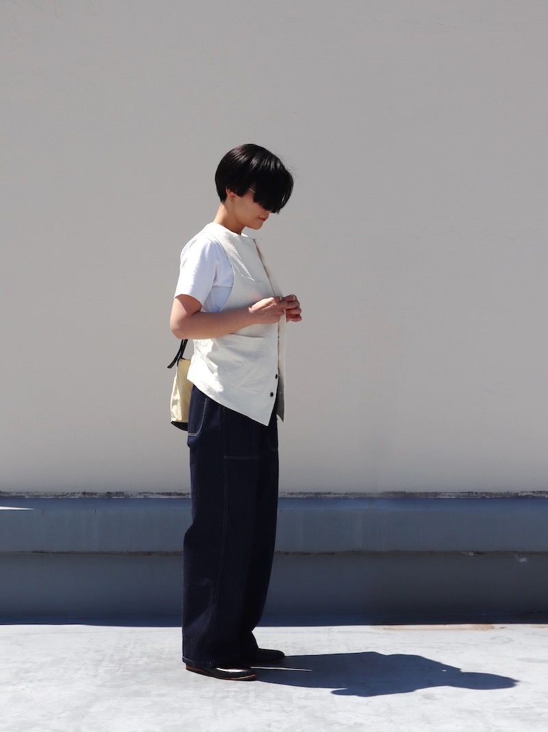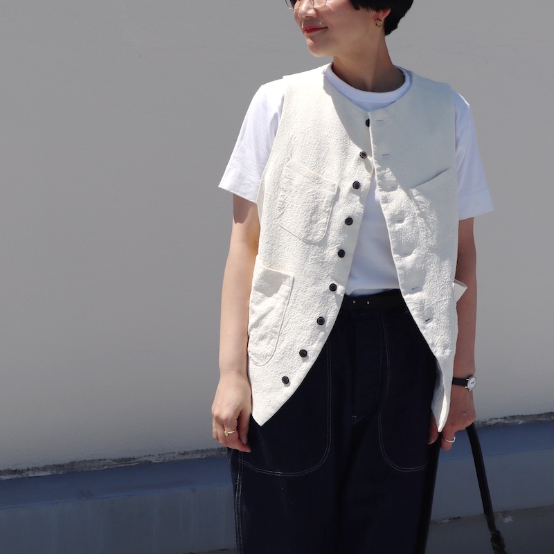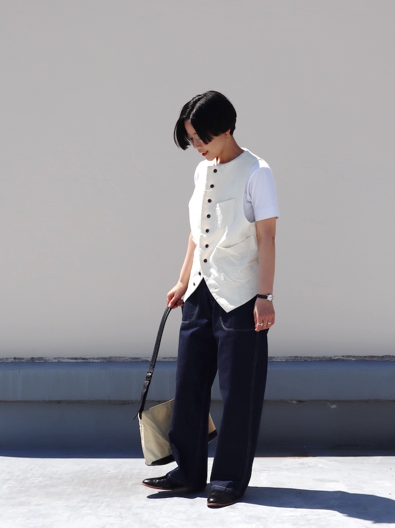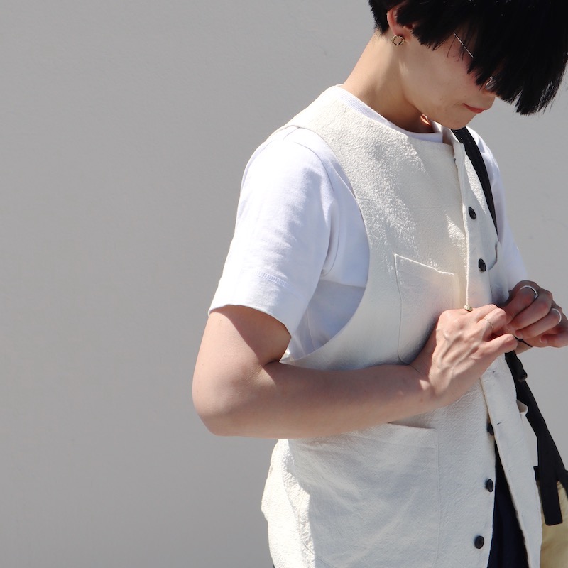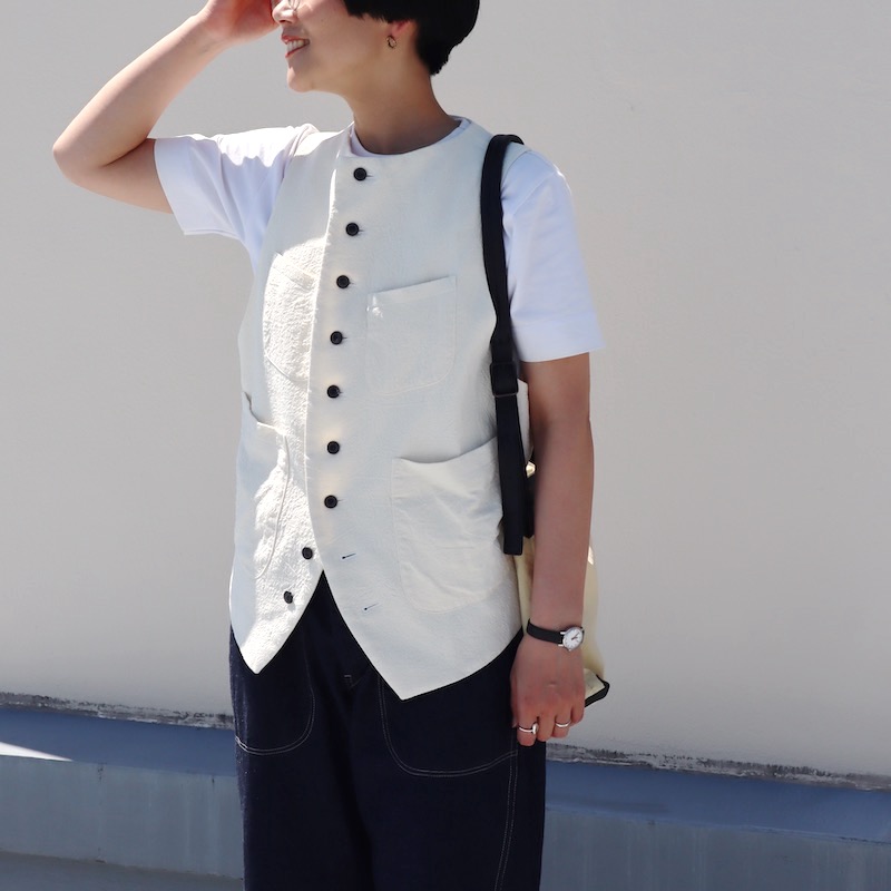 ナチュラルな素材感と実用的なポケット。丁寧な仕様と全体の調和。様々な要素に加え、ひとつまみの余白も内包するこのベストと共に出掛けたら、素敵な詩が浮かんでくるに違いありません。