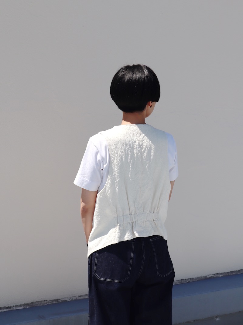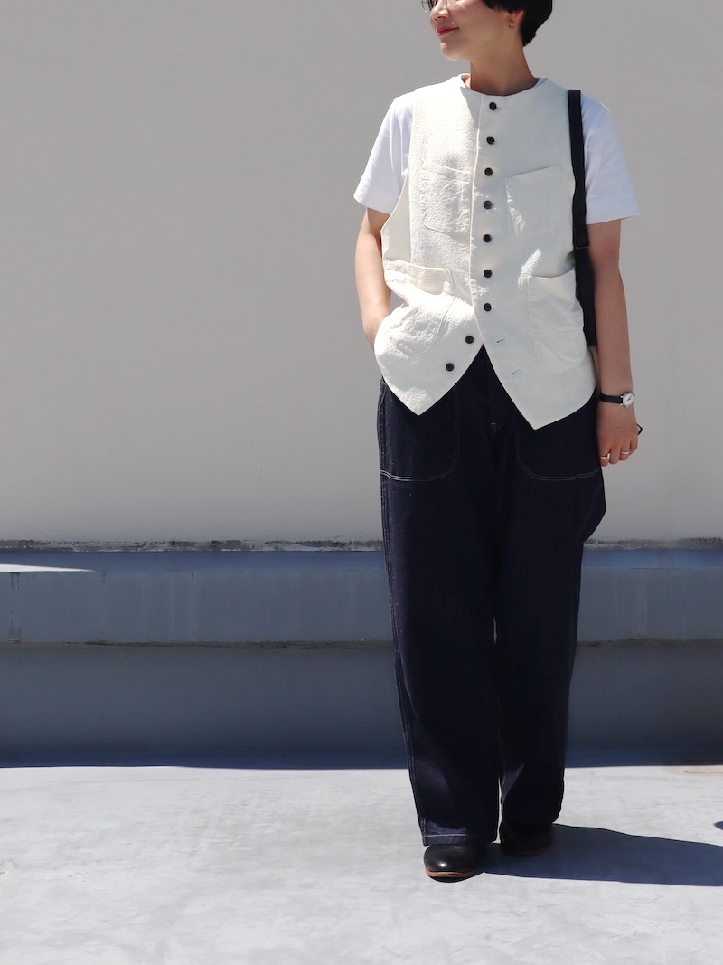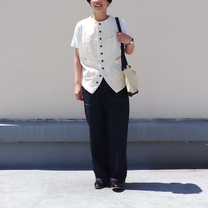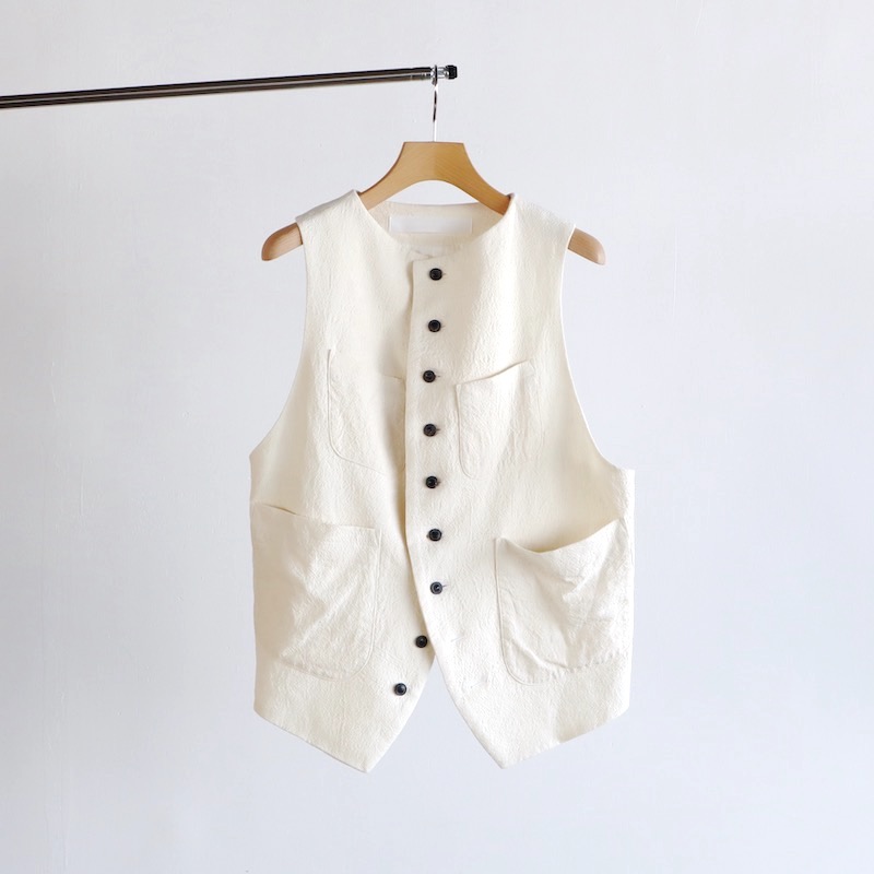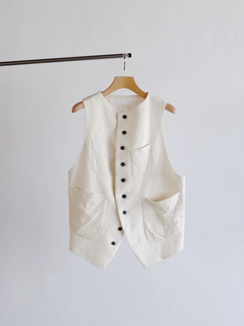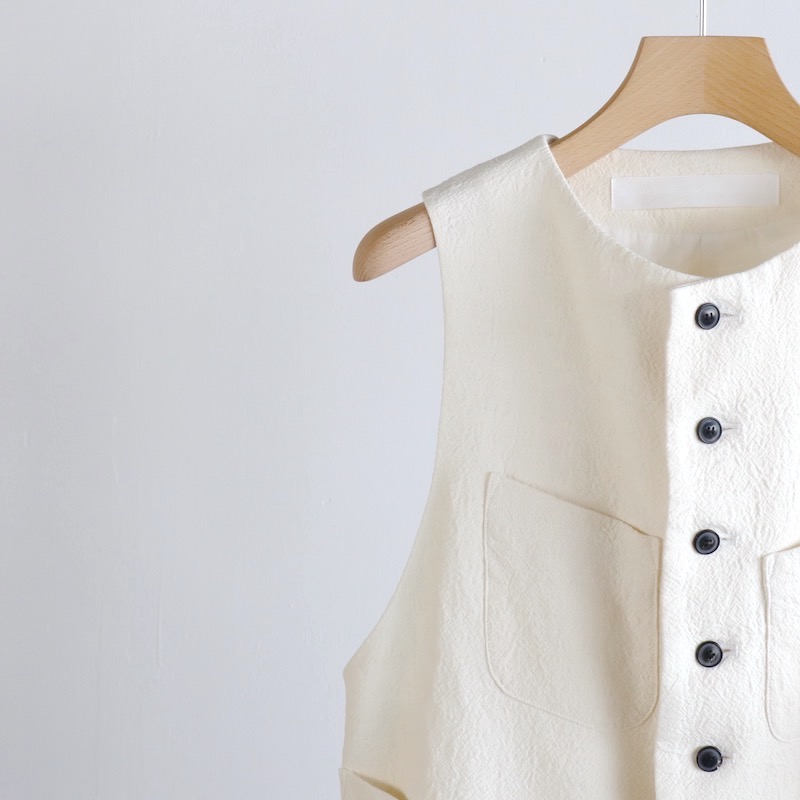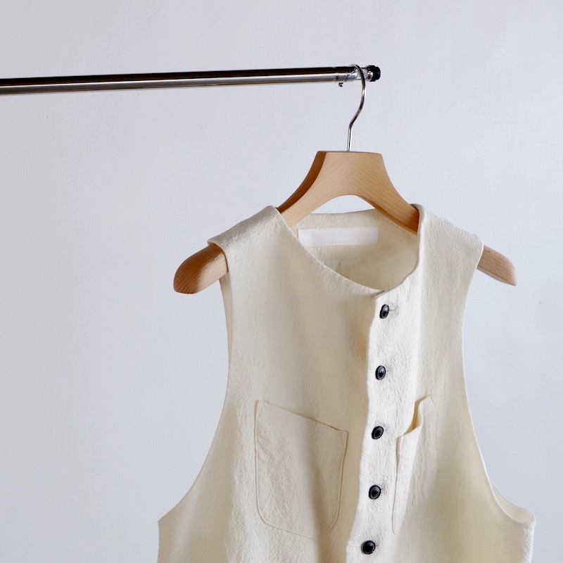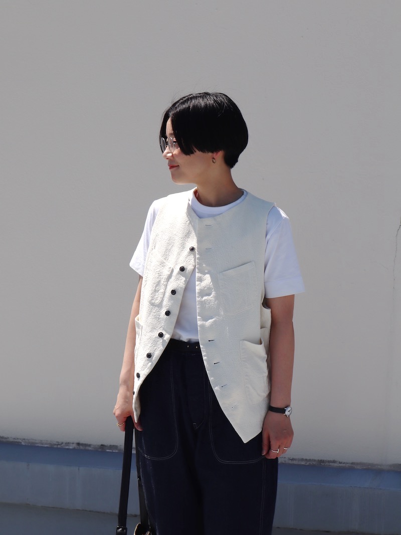 ナチュラルな素材感と実用的なポケット。丁寧な仕様と全体の調和。様々な要素に加え、ひとつまみの余白も内包するこのベストと共に出掛けたら、素敵な詩が浮かんでくるに違いありません。