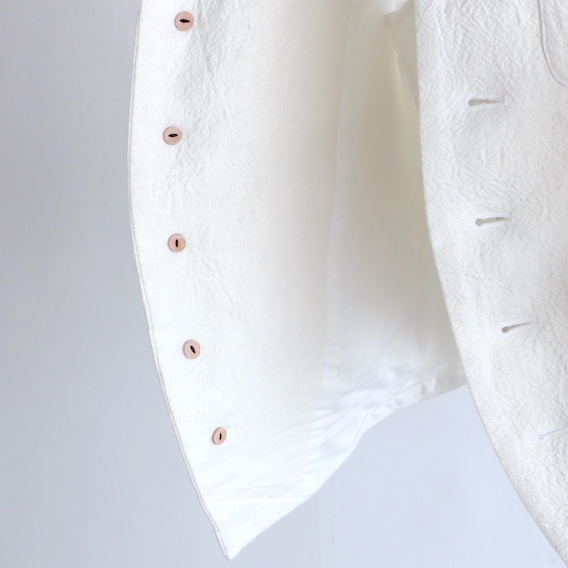 背面にゴムを入れ、後ろ着丈をみじかく整えました。身に付けるだけで背筋の伸びる、端正な印象です。