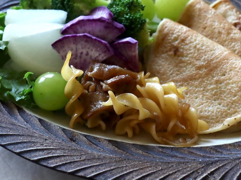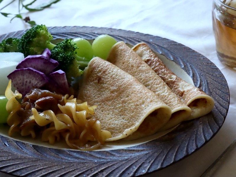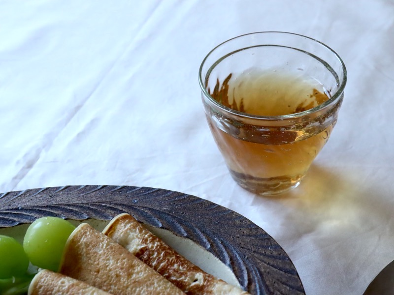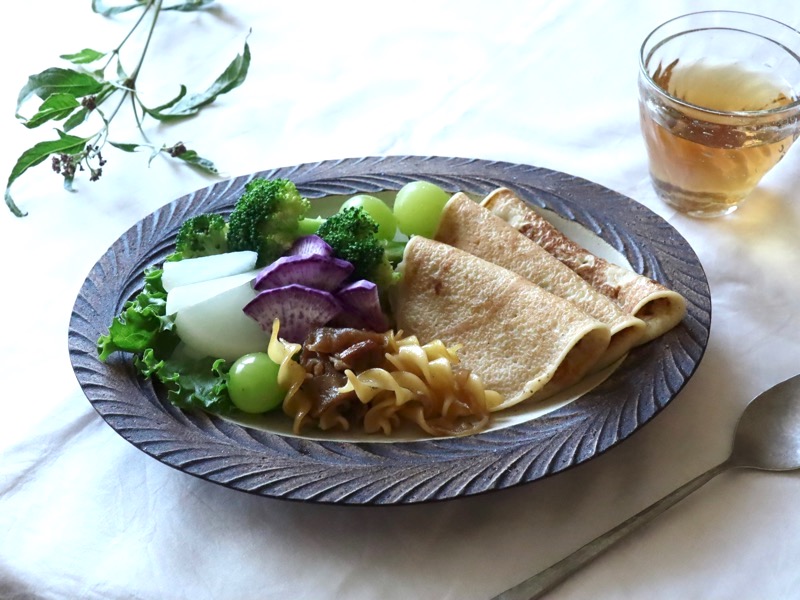 山口起久恵さんの気泡入りの素敵なグラスにダージリン。オーバル皿は盛りつけやすくオススメのアイテム。パンケーキを並べ、パスタを置き、サラダを盛り、最後に隙間に葡萄を。