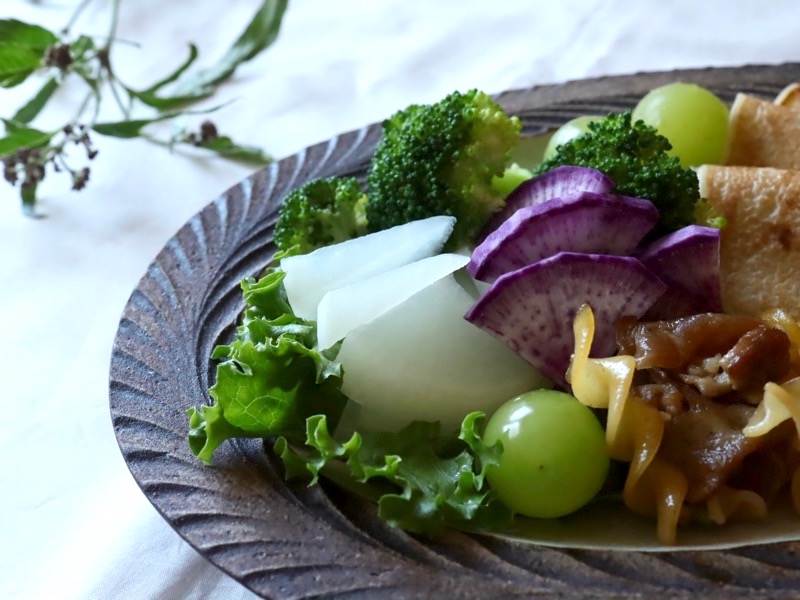 茹でたブロッコリーと大根、紫の大根は生で、と変化をつけて。茹でた大根を冷やしてサラダで食べるのも美味しく。それとシャインマスカット。