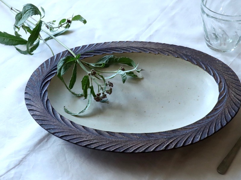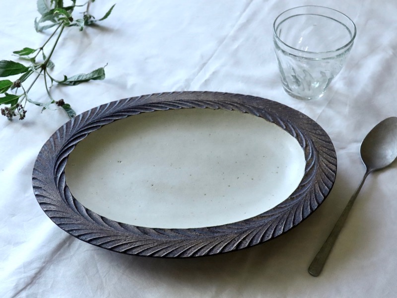 オーバル皿は松塚裕子さん。リムの彫りやフォルムが美しい器作家さん。裕子さんと企画を予定しています。