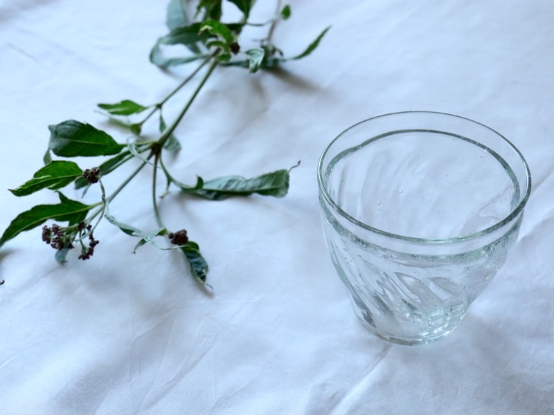 グラスは山口起久恵さん。再生硝子で作られていて色味や気泡が素敵なガラス作家さん。展示会をさせていただいたり常設で並んでいます。