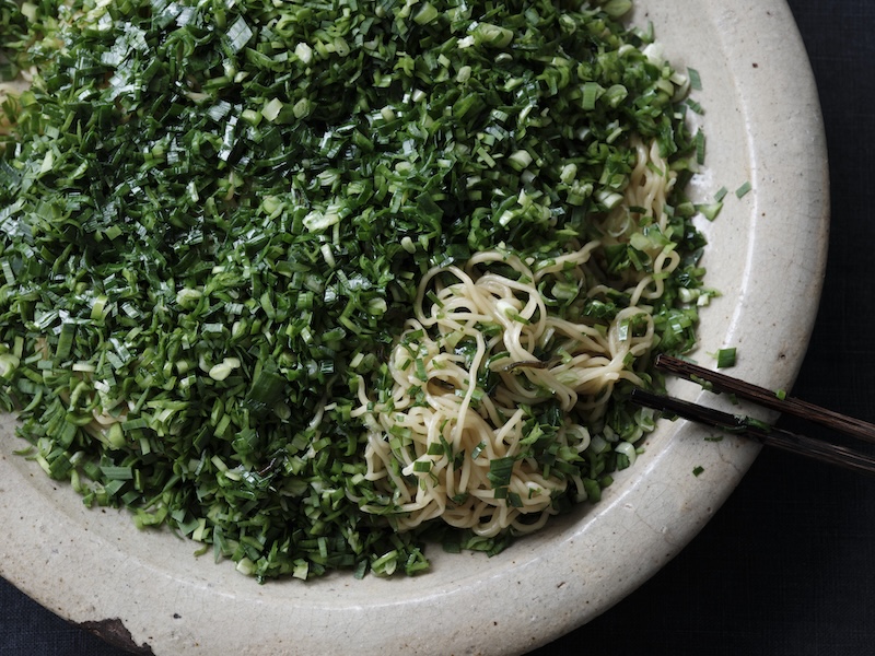 麺に細かく切ったにらをふわっとのせて、熱々の油をジュっとかけたら、