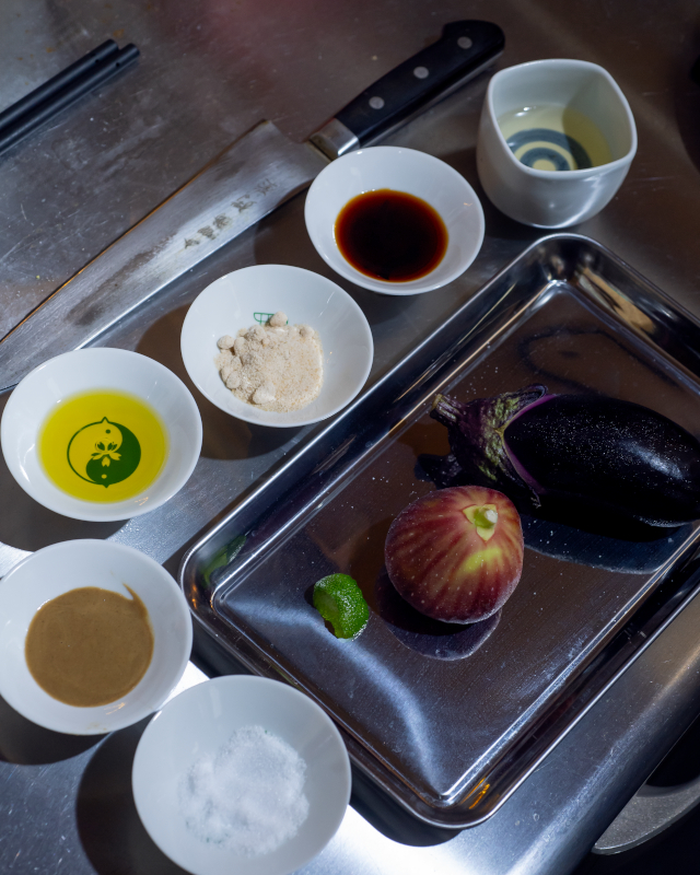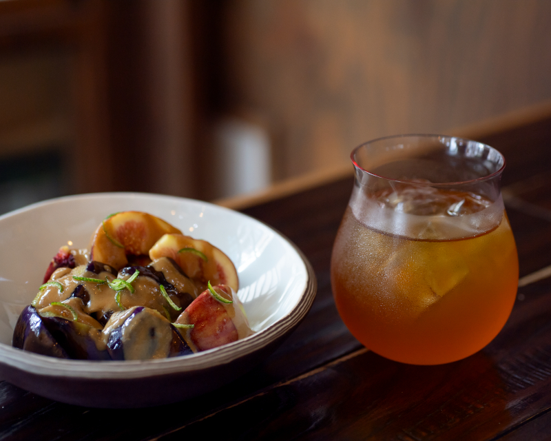 ということで、まず西村さんがつくってくれたのは“ほうじ茶割り”と、秋の食材を使ったおつまみ。トロリとした食感の生のいちじくと炒めた茄子に、濃厚なごまダレをまとわせた味わい深い一皿です。
