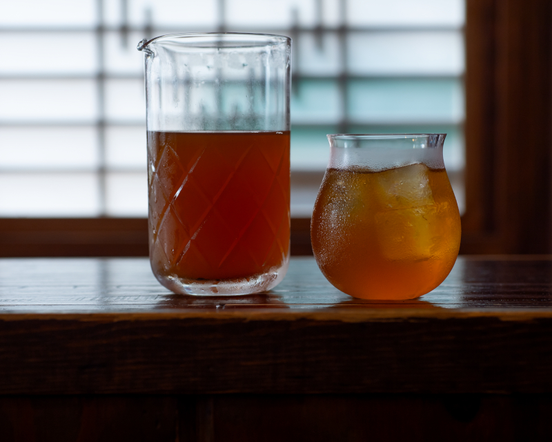 次につくってくれた“お茶割り”は、麦茶バージョン。ほうじ茶よりドライな飲み心地で、複雑味のある香ばしさが魅力です。
