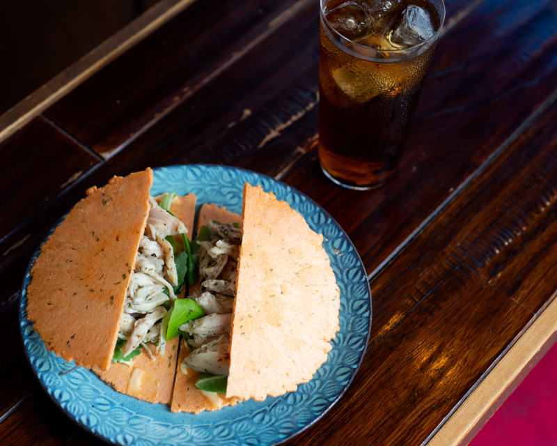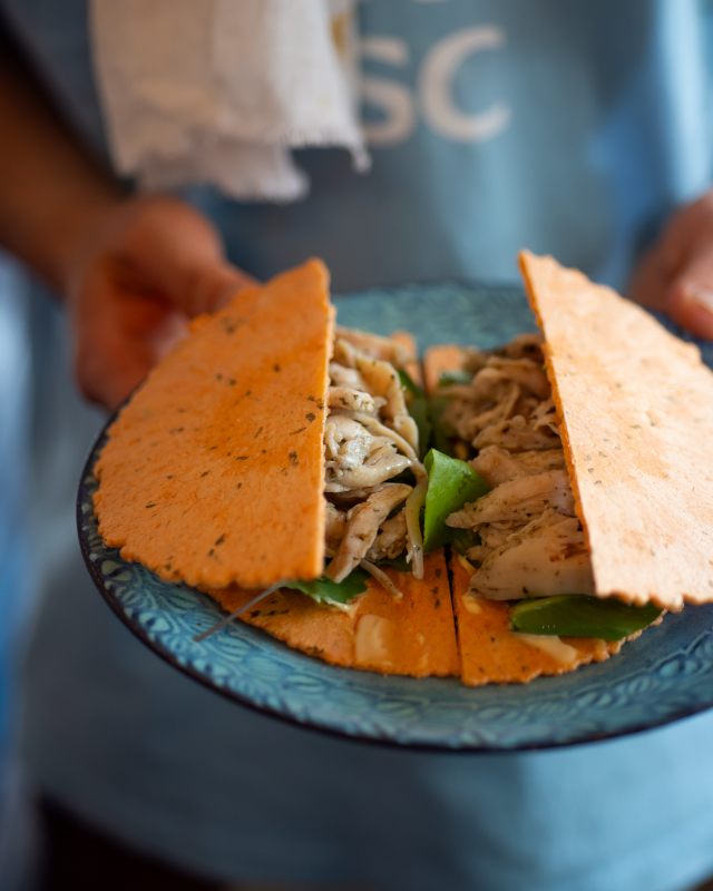 その“麦茶割り”に合わせたのは、「えびせんべいのサラダチキンサンド」。ものすごく凝った料理に見えますが、実は、大判のえびせんべいを半分に切ってマヨネーズを塗り、ほぐしたハーブサラダチキンとベビーリーフを挟んだだけの、超簡単おつまみ!
