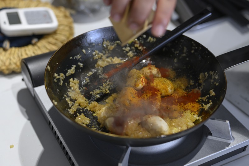 玉ねぎが飴色になったら弱火にし、おろしたニンニクと生姜を加えて炒めたら、半分にカットしたマッシュルームを入れてさらに炒める。マッシュルームに適度に火が通ったら、ミックススパイス(クミン、コリアンダー、ターメリック)とスモークパプリカパウダーを加えて混ぜ合わせ、すりおろしたトマトを入れて強火で炒める。