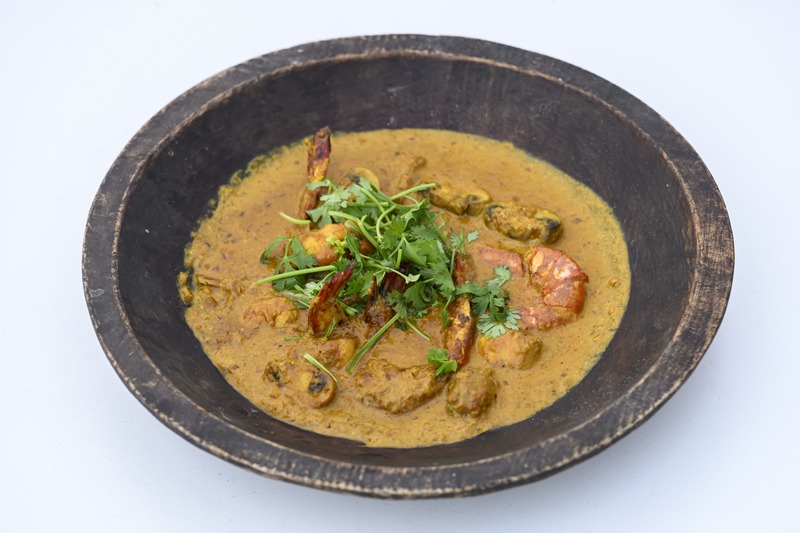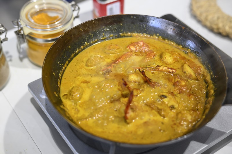 おろしトマトがペースト状になったら、ココナッツミルクと水、塩麹、塩を加え、バットに移しておいた海老を戻して弱火で10分ほど煮込んで完成。盛り付けの最後にパクチーを散らしていただきます。