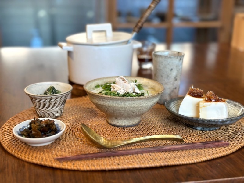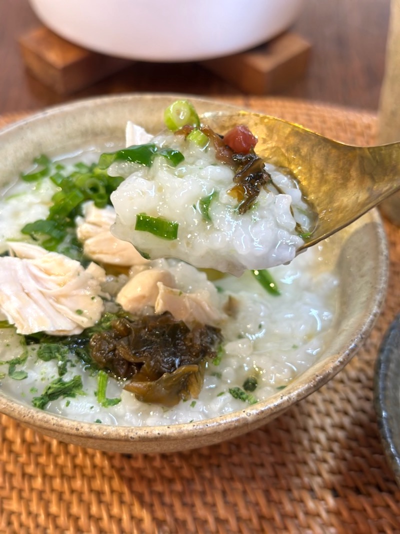 さて。休日の私、お一人様にはぴったりな小鍋に浸水たっぷりしたお米とささみ出汁でたまにかき混ぜながらコトコトコト。あ、洗米したのは煮込み時間が短くできるというところで。今回煮込みは約 20 分たまに混ぜて出来上がり。茹でたささみは最高のトッピングに~。いつ食べようかと買い置きしていた広島菜とフリーズドライパクチーが今回活躍!!!