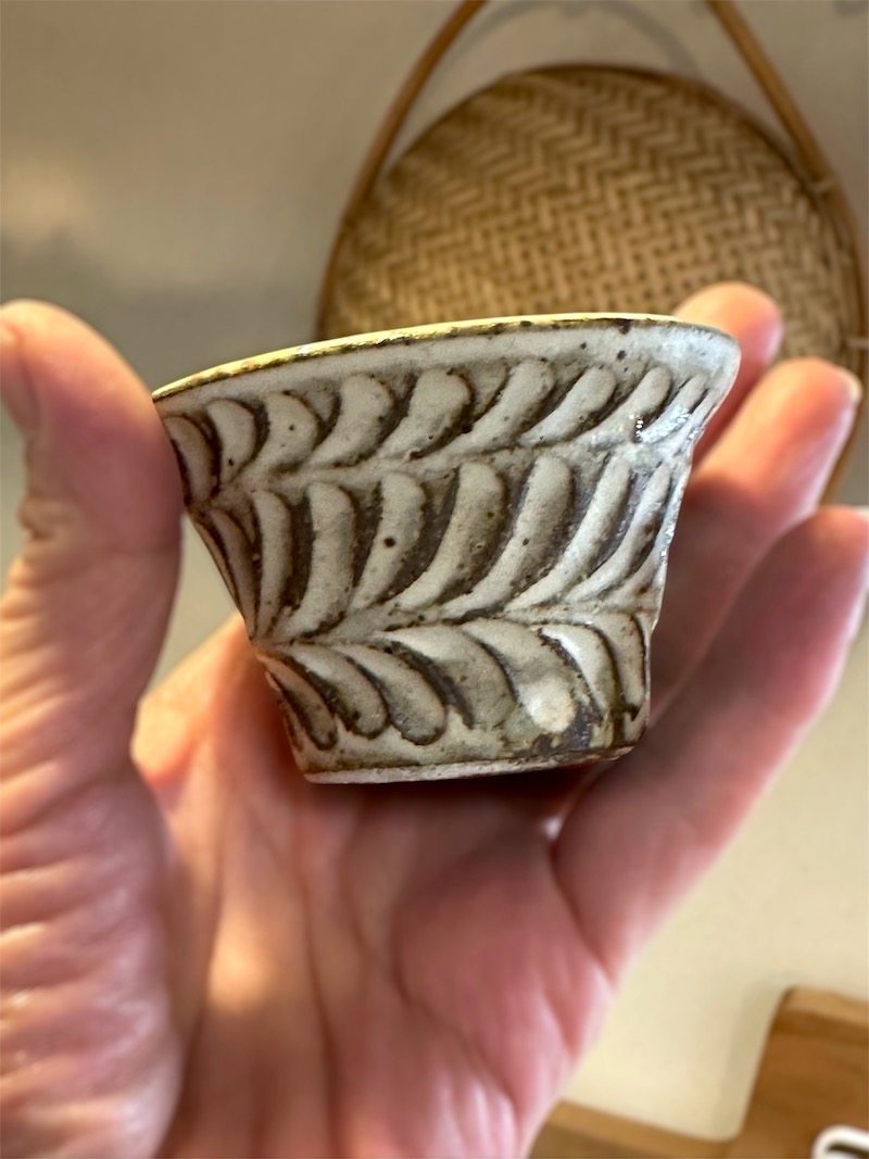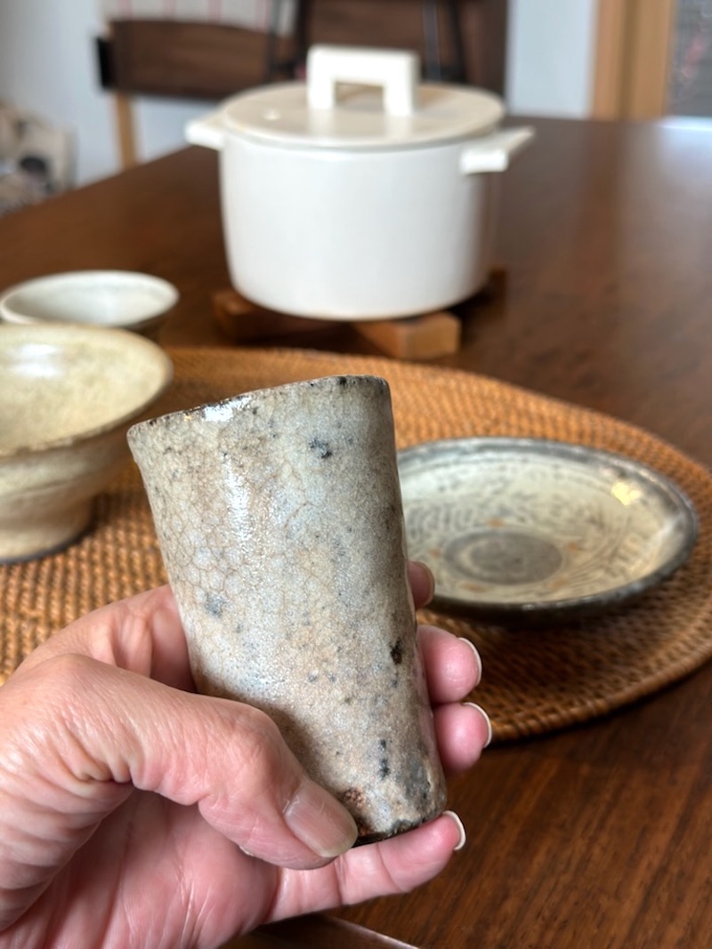 奈良・廣辻有美さんの「フレアカップ」にはほうれん草の胡麻和えを。美しいしのぎと土感満載ながら非常に軽いとお客様方から大好評。日常使いしながら、ふとしたおもてなし料理までと配慮されています。ぐい呑みに使っても◎!!!