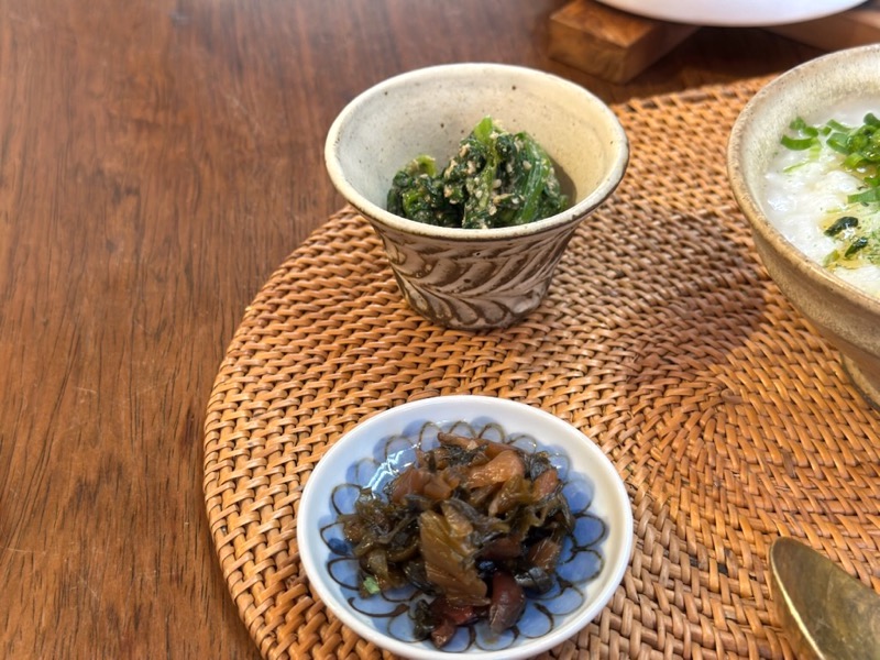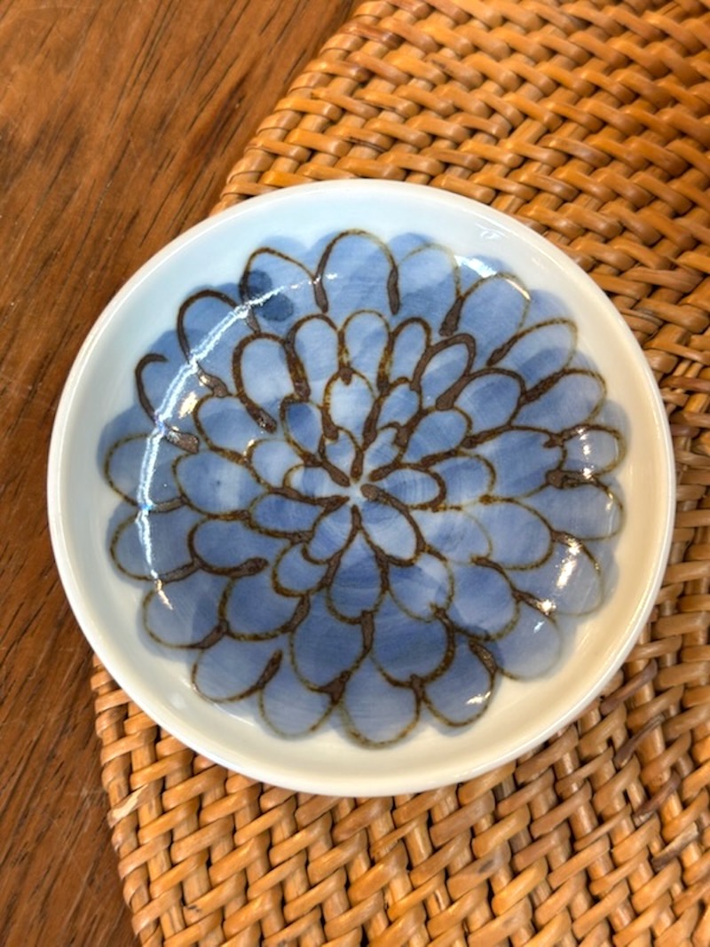 広島菜を乗せた豆皿は、石川・樋山真弓さんの「染付ぼたん豆皿」。花びらたっぷり呉須の青が優しい絵付けで、ちょいちょい食卓にでます。ほっこり使いやすい九谷焼。箸置き代わりにもぴったりです。