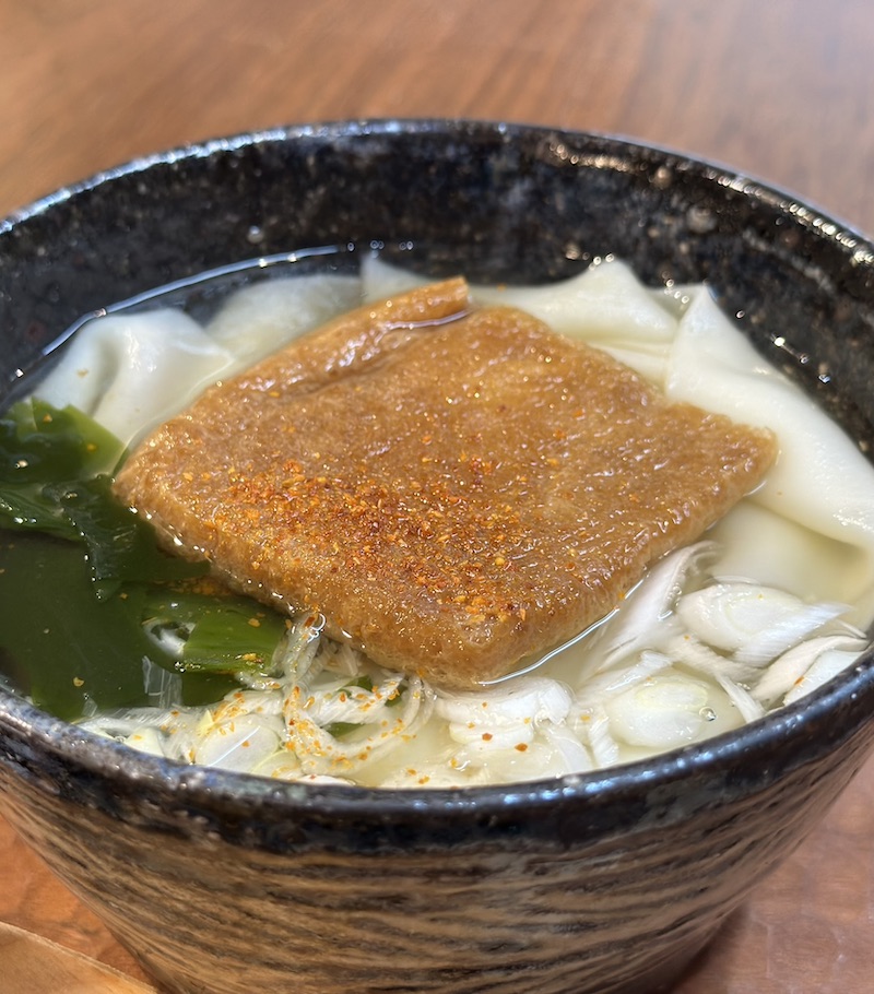 きび砂糖で甘さ優しい油揚げ。温玉は、某百円均一で買った熱湯を注いでシンクで放置するだけでできる優れモノ。油揚げも程よく煮込んで味が染み込む間に、最近はまっているおうどん屋さんにひもかわ買いに車で5分。
