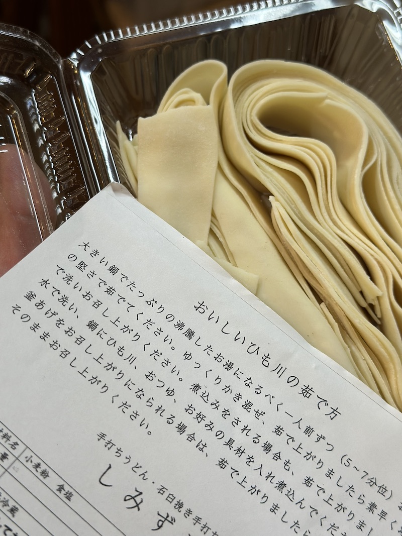 三代目こだわりの「農林61号」(小麦本来の豊かな風味、旨味、「内麦臭」という香ばしさがあり、グルテンが少なめの品種らしい)を使用されています。本当に美味しい。そんなひもかわうどんを持ち帰り、早速茹でていただきました!休みだしネギもたっぷり入れちゃいました。