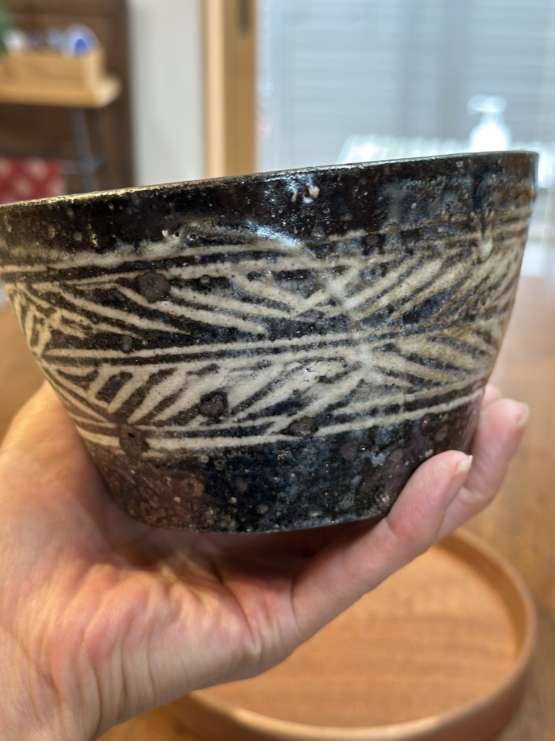 土を感じる手触りと象嵌の黒いうつわ。鉄粉が宇宙の星のようです。うちではやはり丼ものに活躍。鉄火丼の赤、親子丼の黄色等とても美味しく映えさせてくれます。