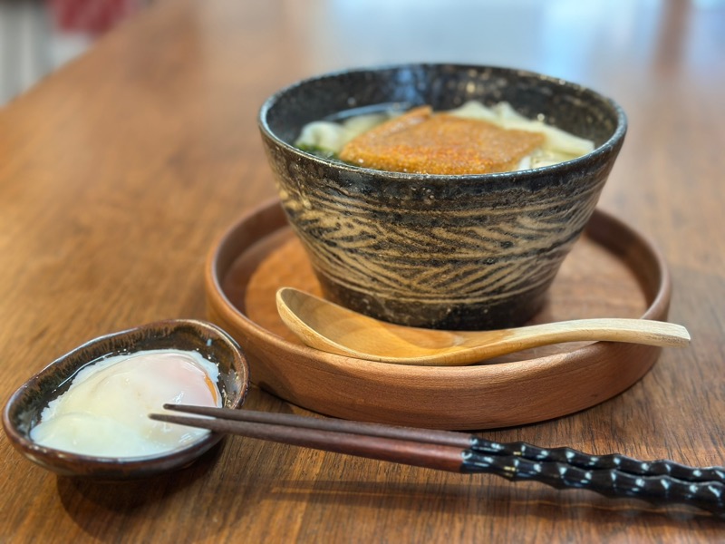うつわは、おどんぶり代わりに大阪・八田亨さんの「黒三島手深鉢」、温玉はお友だちのお店で手に入れた、茨城・ムーニーともみさんの「豆皿」。