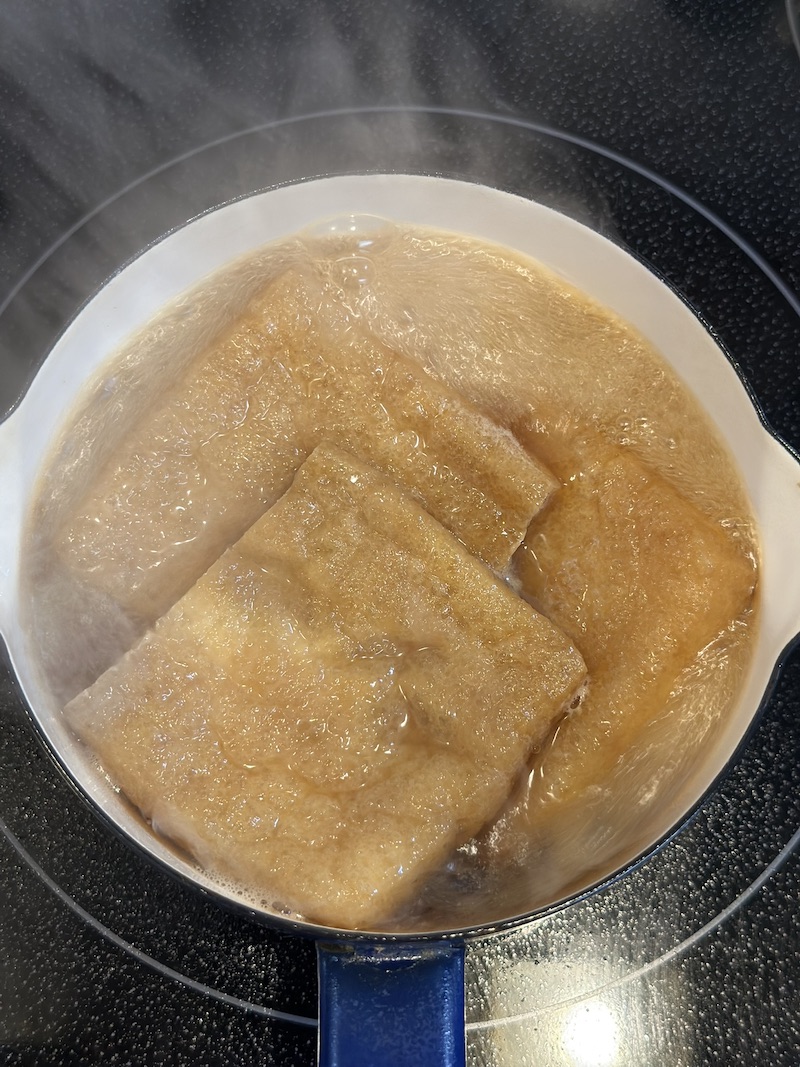主人公のひもかわはお店の開店を待って買いに行くこととして、とりあえず油揚げを煮ましょう。よって遅い朝ごはんに今日も決定。