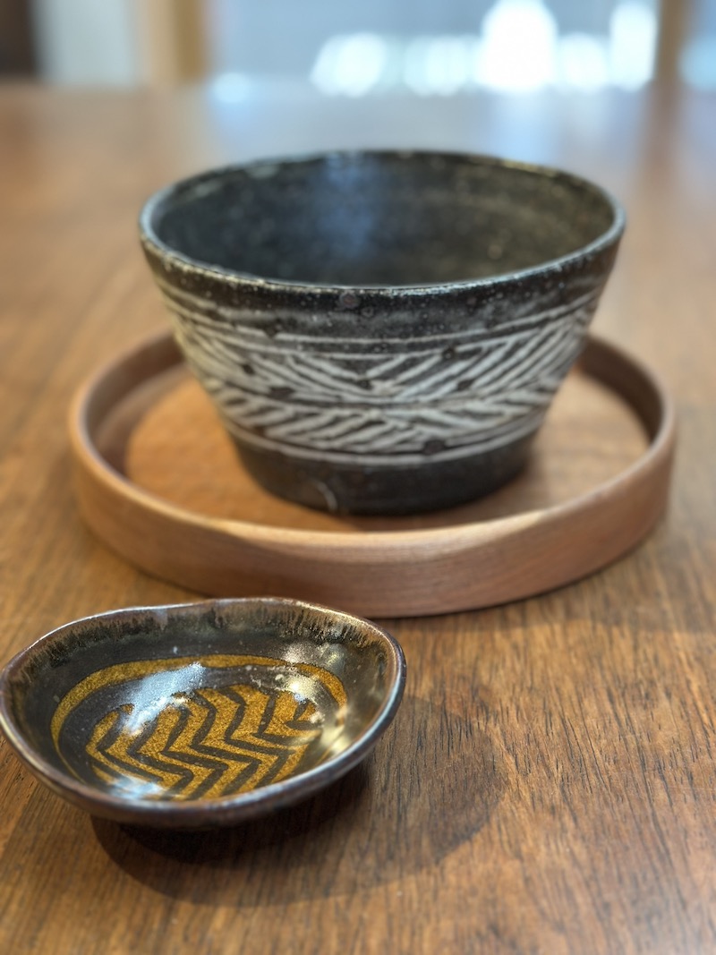 土を感じる手触りと象嵌の黒いうつわ。鉄粉が宇宙の星のようです。うちではやはり丼ものに活躍。鉄火丼の赤、親子丼の黄色等とても美味しく映えさせてくれます。