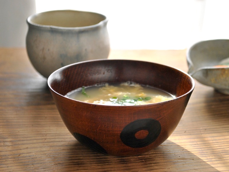 忙しい時はこれだけで済ませてしまうこともありますが、寒い時期はやっぱり汁物があると体が温まりますよね。今朝は、卵スープをお気に入りの漆器のカップで。箸休めにはお漬け物を。