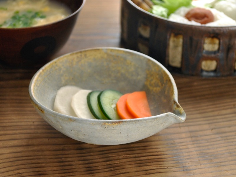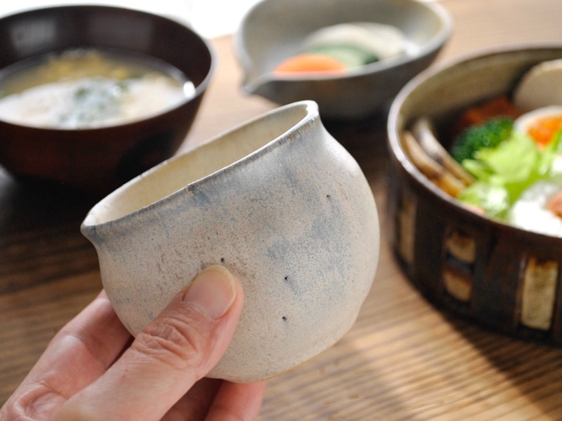 漆器は不思議と熱くならないので、汁物にはもってこいの器ですね。意匠がおもしろい片口は、それだけで食卓に動きが出るので、形やサイズ違いでいくつか持っているととっても便利です。