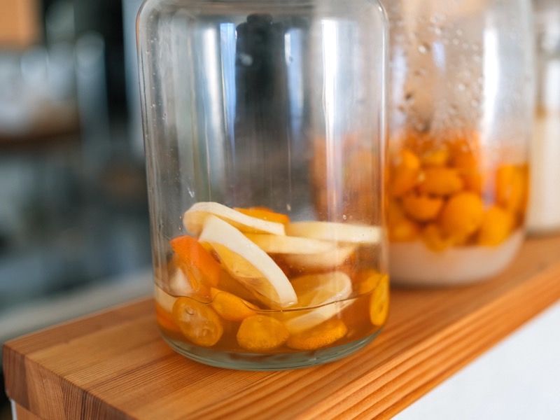 ヨーグルトには「金柑レモンはちみつ」をかけました。ご近所さんから金柑やレモンをたくさんいただいたので、はちみつ漬けに。隣では金柑の酵素シロップを仕込み中。フルーツをいただくと瓶で色々作るのが楽しいです。