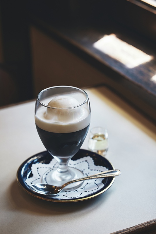 ボクがここで必ず頼むのが「モカ・ゼリー」。グラスのちょうど下半分ほどを満たしてかためたコーヒーゼリー。ボール状に形を整えたバニラアイスクリームを上にのせ、冷たい生クリームをたっぷり注ぐ。するとアイスクリームに触れた生クリームが凍ります。凍った生クリームがまるで卵の殻のようにアイスクリームを包み込み、コーヒーゼリーの表面を満たして仕上がる。