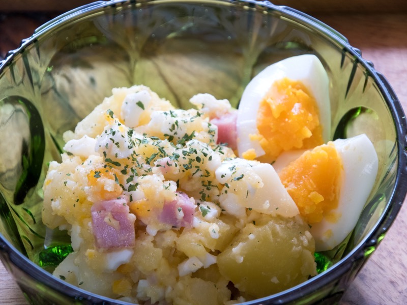 2品目のポテトサラダも我が家の定番メニュー。北海道のホクホクのじゃがいもにゆで卵、ベーコン、コーンを入れて、ちょっとだけ多めに作り置きしておきます。そうすると朝の忙しい時でも冷蔵庫から取り出し器に盛り付けるだけの簡単メニューに。じゃがいもは粗めにつぶしザクザクとした食感も味わうのが我が家流。