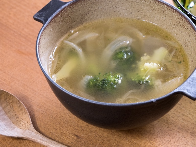 3品目はオニオンスープ。札幌産の玉ねぎ「札幌黄(さっぽろき)」はご存知ですか?生産量が少なく一時は幻の玉ねぎと呼ばれた希少な玉ねぎです。味が濃く、加熱すると甘みがとっても強くなるので、スープには最高です。コンソメスープに隠し味のバターを少々。栄養バランスと色味を考えてブロッコリーも入れました。