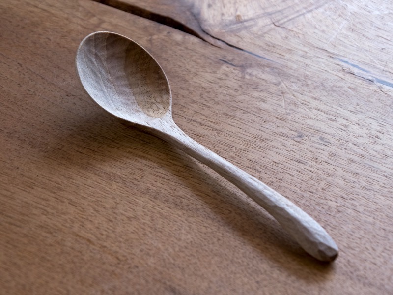 スプーンは函館の工房「木の匙 Ranpuu」のスープスプーン(くるみ)。丁寧に木から削り出し、あえてその削り出した質感を残した木肌は手触りよく、滑り止めにもなっています。