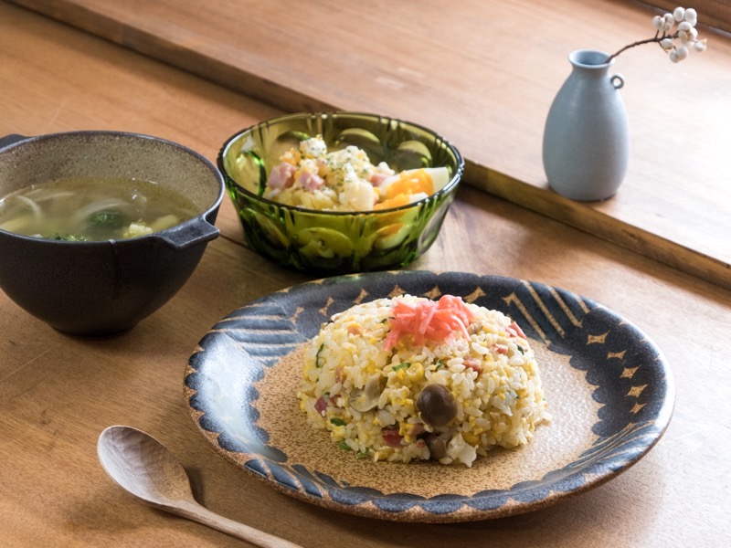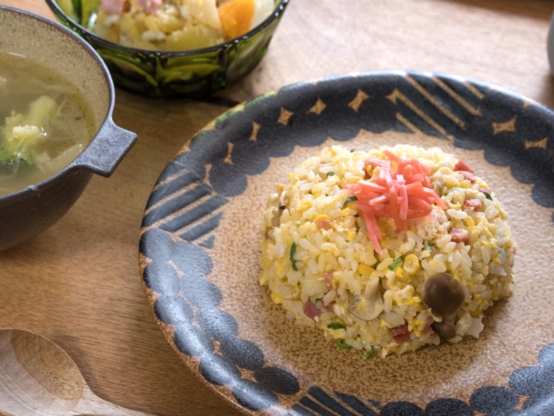 今朝は「炒飯」をメインに「ポテトサラダ」「オニオンスープ」のお手軽朝食。メインの炒飯は得意メニューの一つで、試行錯誤の末にようやくお店で出てくるような「パラパラ炒飯」にたどり着くことができた自慢の一品です。パラパラ炒飯の秘訣はご飯の炊き具合と卵の入れ方。具材はシンプルに卵、ベーコン、シメジ、ネギ。