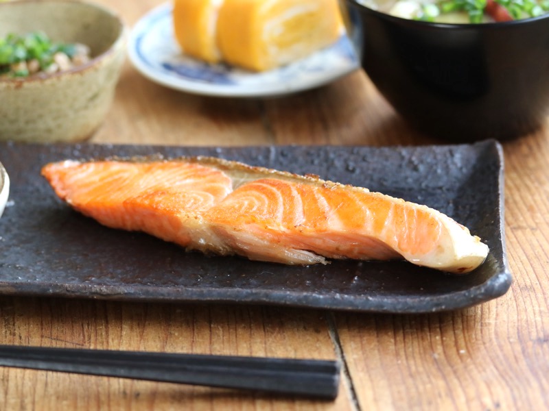 焼き鮭をのせたのは、遠藤素子さんのうつわ。 ほっこりとした佇まいが、素朴な和食によく似合います。