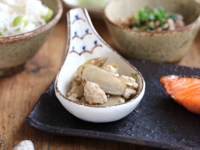 蓮華型の子付けは菅野一美さんの作品。今日は、ごぼうと挽肉のしぐれ煮を添えました。