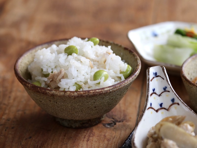 ご飯は、シーチキンと枝豆を混ぜて炊いた、我が家の定番炊き込みご飯です。手軽にたんぱく質も摂れる、頼もしい一杯。こちらも馬渡新平さんのお茶碗です。荒々しい北海道の土を使って作られる作品は、素朴なご飯もダイナミックに演出してくれます。