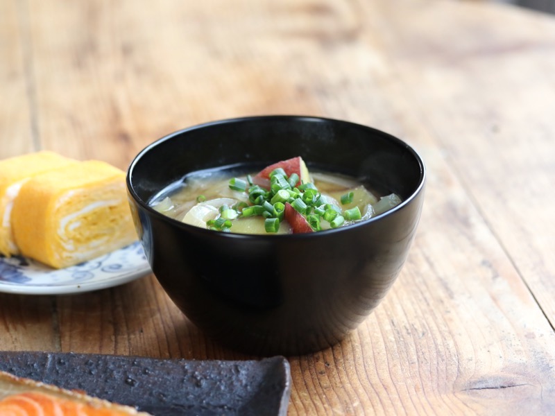 お味噌汁は具だくさんに。 お味噌を受け止めるお椀は、ふじい製作所さんの漆椀です。口当たりがとても滑らかで、料理の味わいを一層繊細に引き立ててくれます。