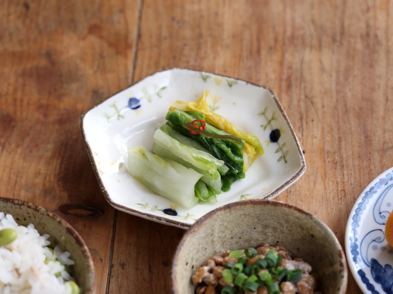 お漬物は吉川商店さんの浅漬け。見つけたときはついつい大量に買い込んでしまうほどお気に入り。白菜の爽やかな甘みが、箸休めに心地よい一品です。盛り付けたのは、こちらも菅野一美さんの小皿。柔らかなタッチの絵柄が、心を静かに整えてくれます。