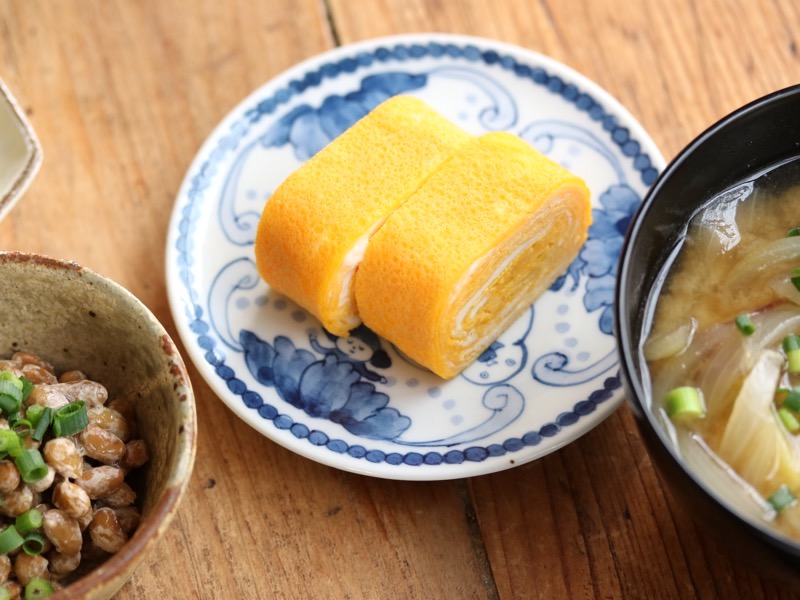 卵焼きは、シンプルに少し甘めが好み。 盛り付けた小皿は、レイチェル・オムレットさんの作品です。独特の世界観で描かれる、ユーモアに満ちた絵柄は、朝の食卓に楽しさと活力を添えてくれます。