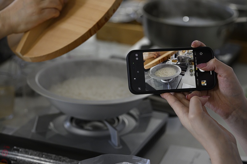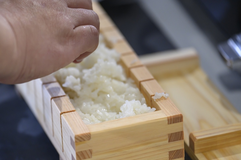 「酢飯作りは、後から寿司酢を加えることを考慮して、お米をぱらっと炊き上げておくとちょうど良い食感になります。お米の炊き上がりには鍋の熱伝導率が深く関係しているので、水分量多めのもっちりした炊き上がりにしたい時は、土鍋のように厚みのある熱伝導率の遅いものが適しています。その逆で、ぱらっと炊き上げたい場合は、薄めで熱伝導率の早い鍋がおすすめなんです。HEGEは薄くて軽いアルミ製なので熱しやすく冷めやすい。酢飯づくりは冷ます工程も必須なので、そういった意味でも非常に便利なんです」