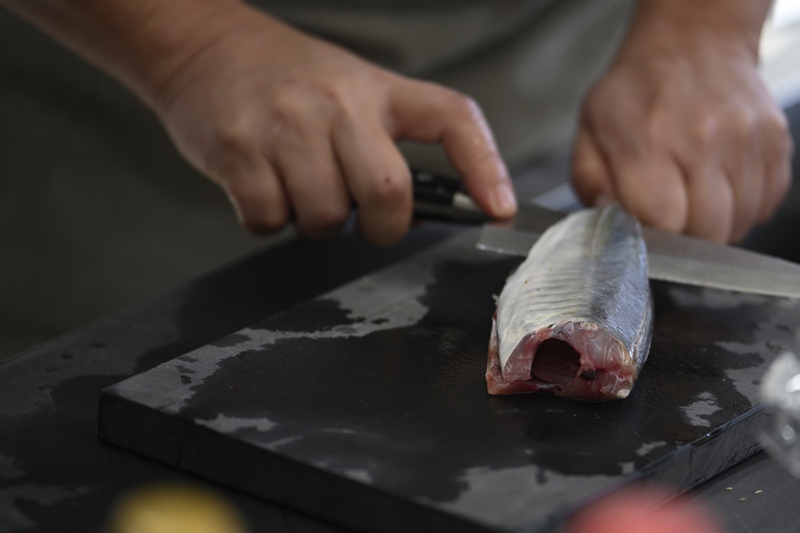 「鯵の下処理は、今日は念のため酢にしっかり5分漬けましたが、今の時期は鮮度が良いものも多いのでさっと酢にくぐらせる“酢洗い”でも表面の雑菌を落とせます。ほかの青魚、鯖とかは身の表面から中まで白っぽくなるくらいしっかり酢に漬けて、しめ鯖にして押し寿司にするのも美味しいですよ。ホームパーティでも喜ばれる一品なので、ぜひレパートリーに加えてください」。
